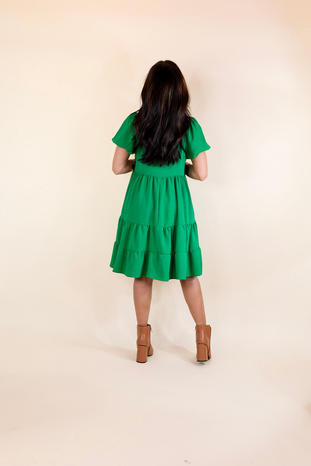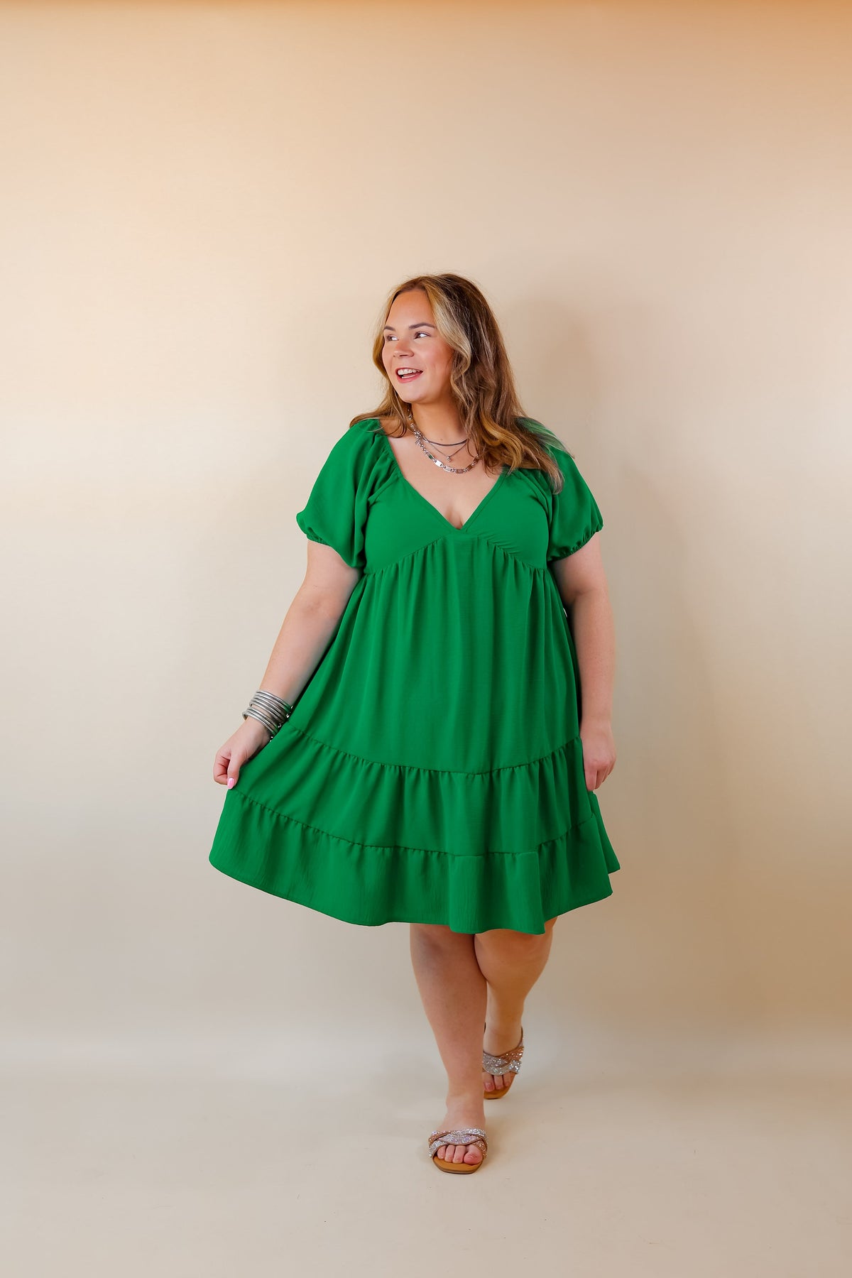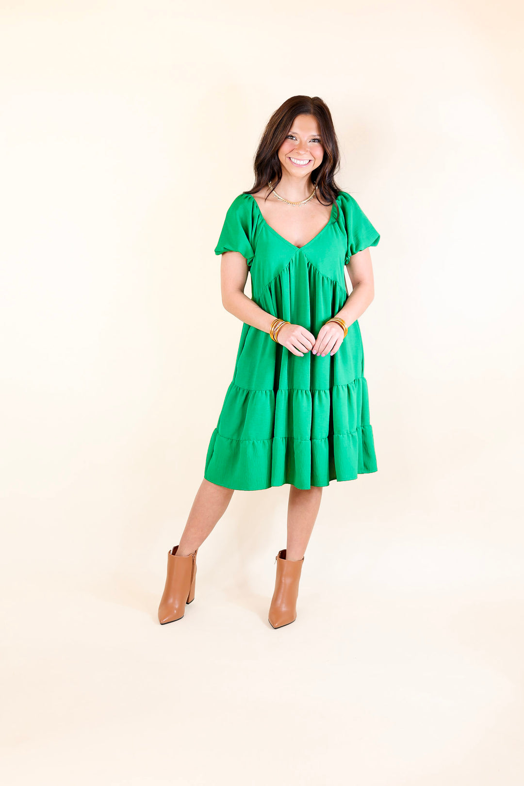 The Graceful Journey dress offers a striking aesthetic, with a v neckline, short balloon sleeves, tiered skirt, and convenient pockets. The refreshing green color brings a cheerful vibe to any day. Effortlessly stylish, this dress is sure to be a hit. Pair this with booties for a cute look! Dress is fully lined.