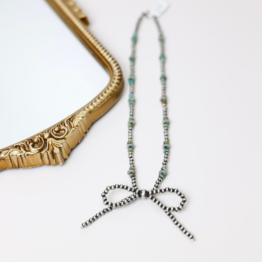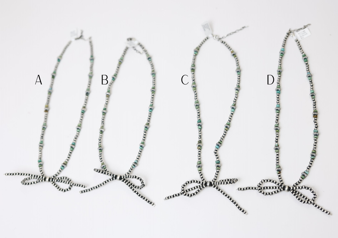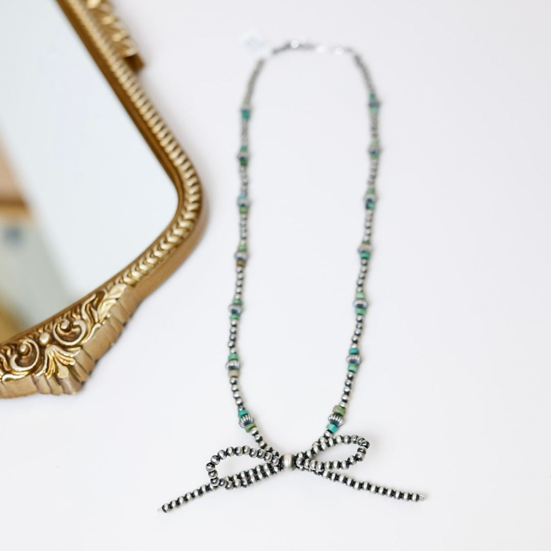 Love bows and western fashion? This necklace is a timeless piece designed to elevate any outfit. Featuring a beautifully sculpted bow tie that exudes both charm and grace, this handmade necklace has authentic turquoise accent beads throughout. Perfect for both casual and formal occasions, this versatile accessory combines classic style with modern craftsmanship, making it a stunning addition to your jewelry collection.