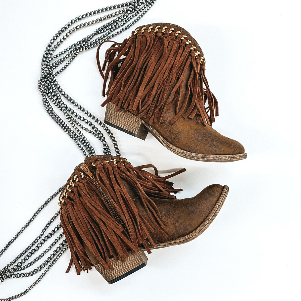 Very G | Rebel Girl Heeled Ankle Booties with Fringe in Brown - Giddy Up Glamour Boutique