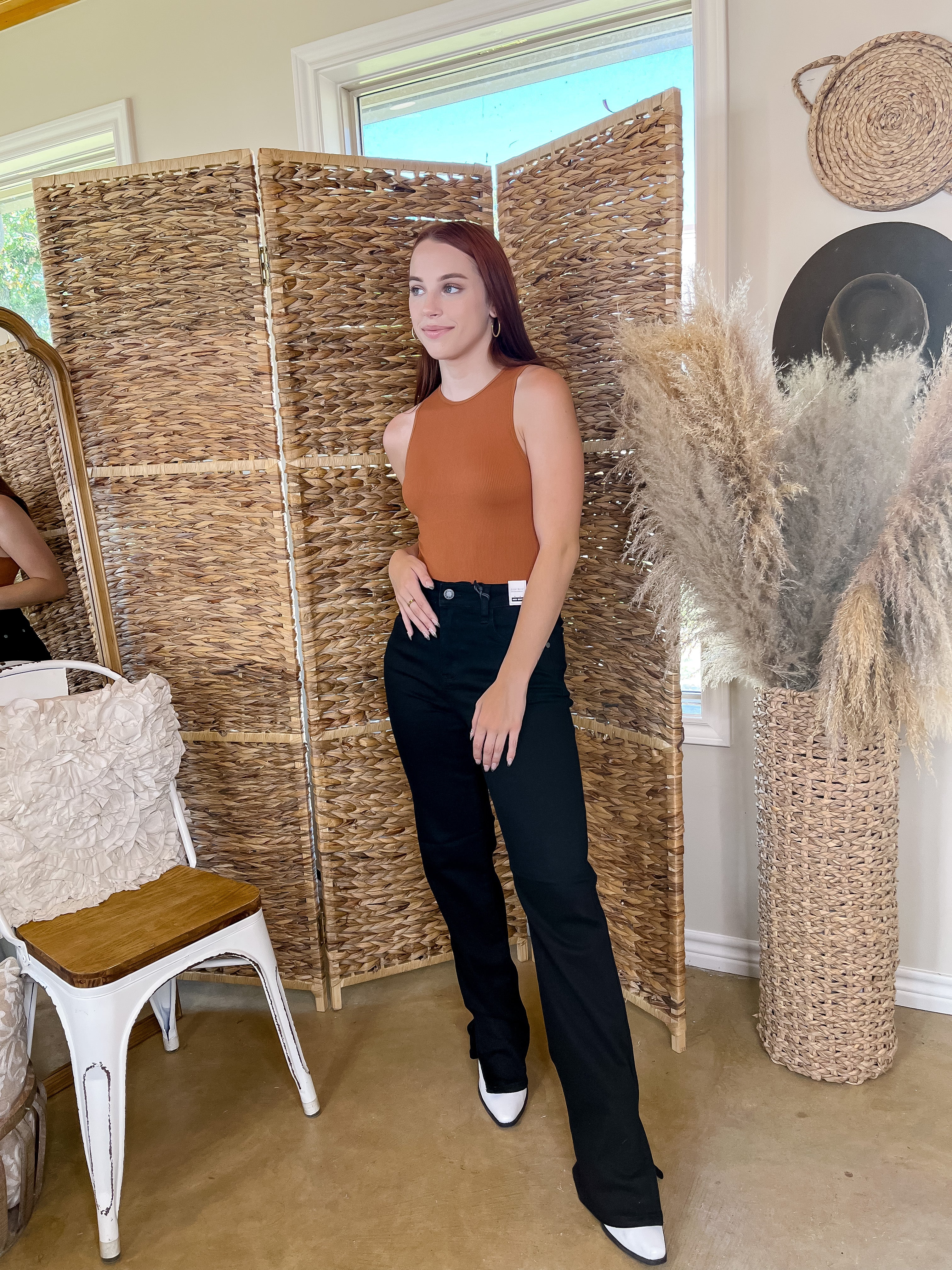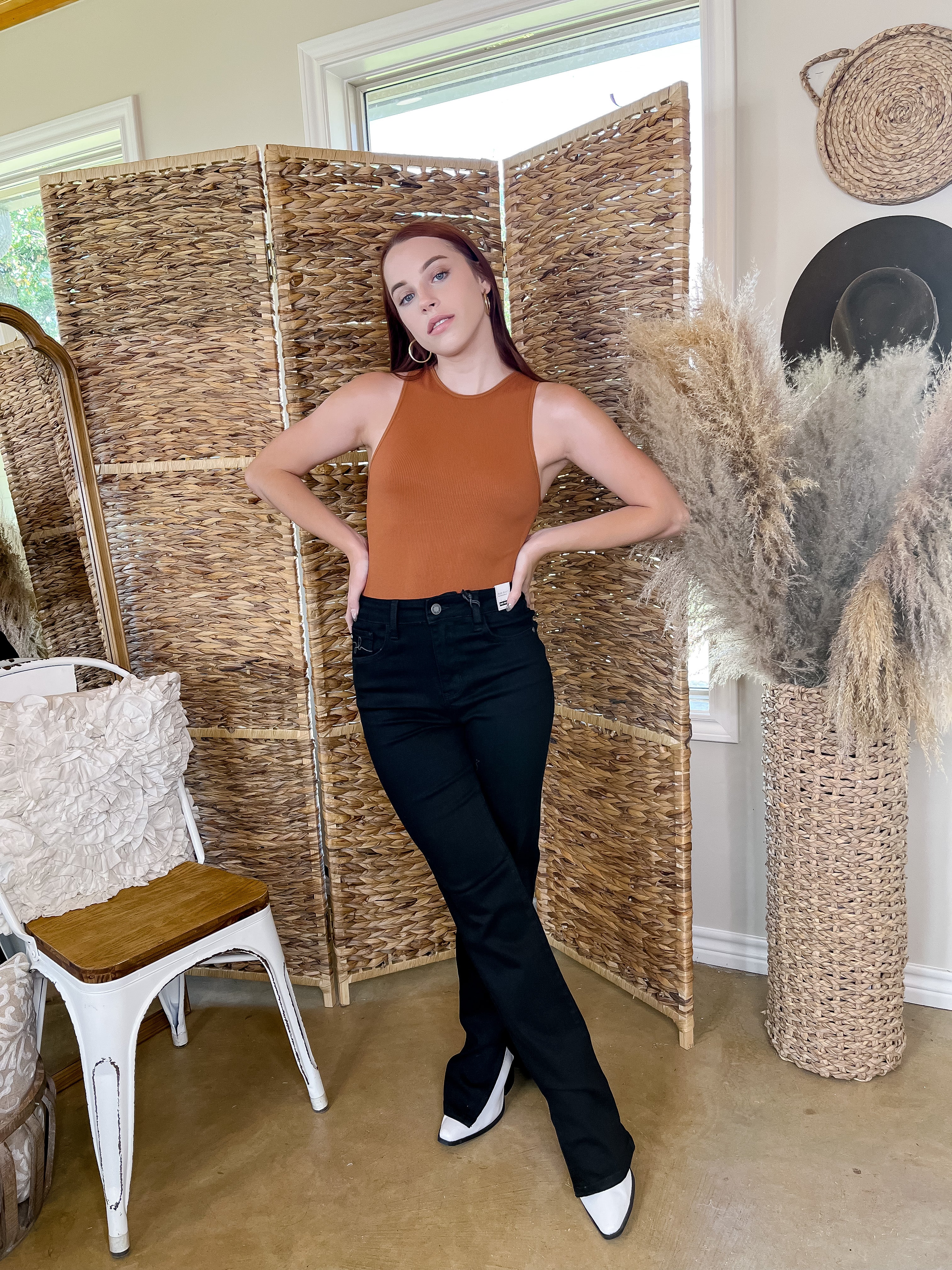 Love and Leisure High Neck Ribbed Tank Top Bodysuit in Clay Orange