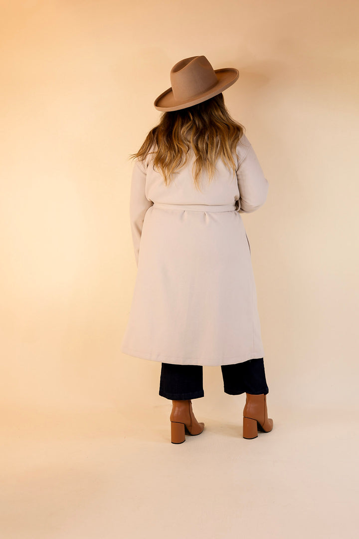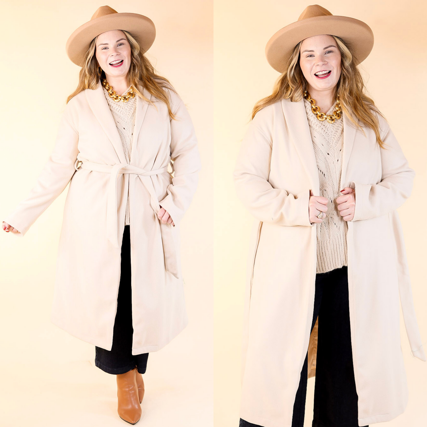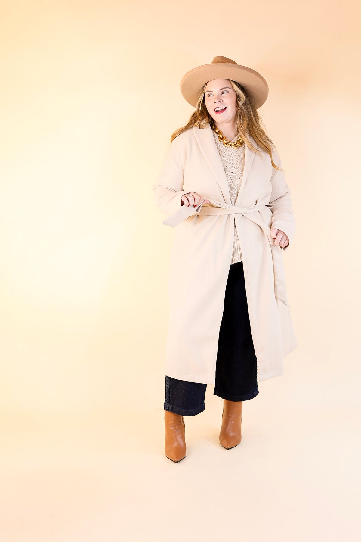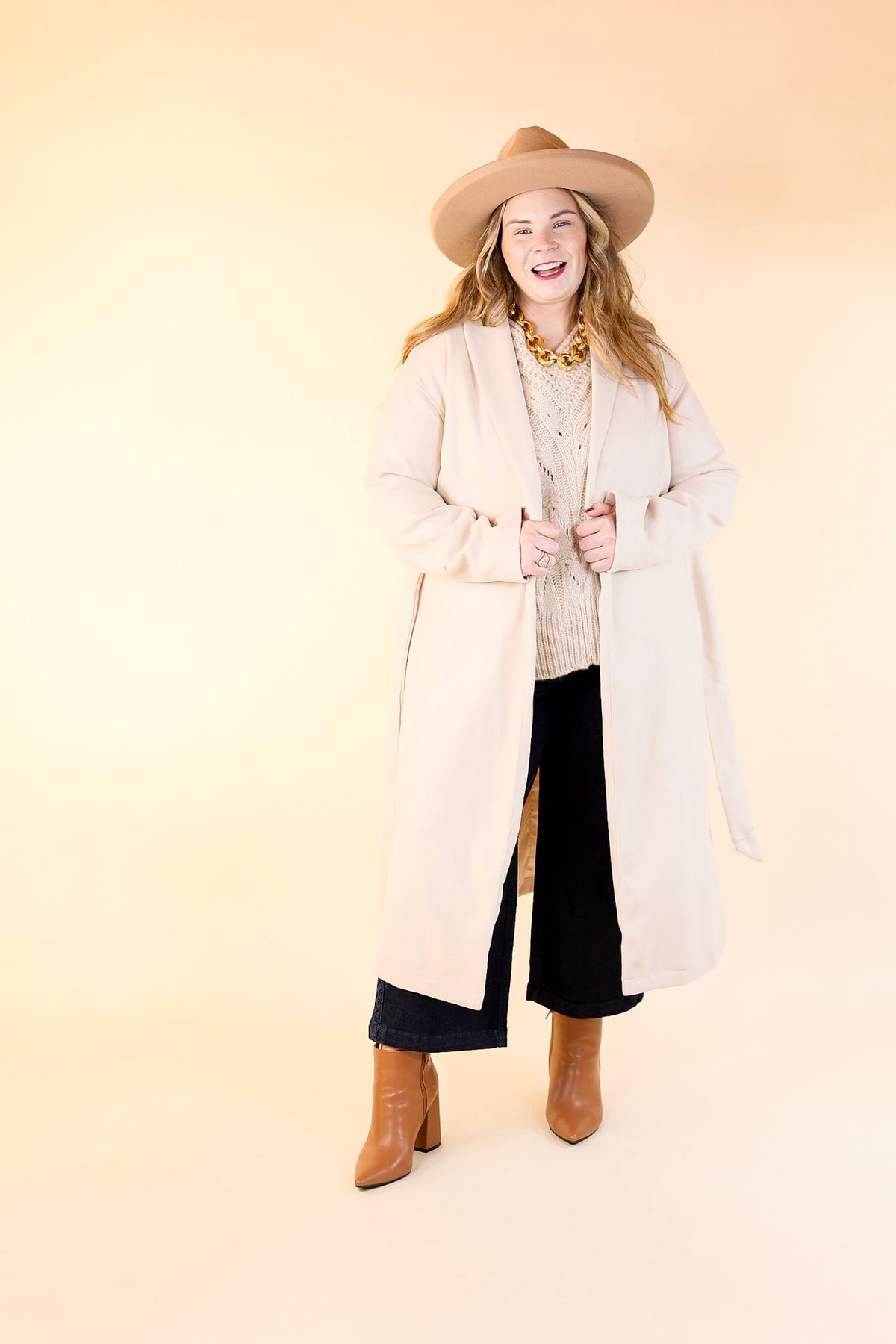 Hollywood Holiday Open Front Long Coat with Waist Tie in Beige