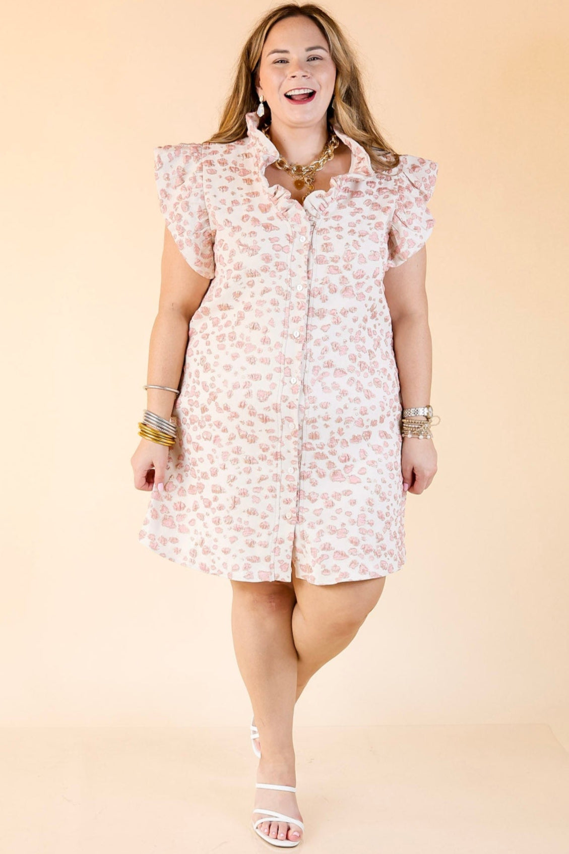 Turn heads in the In the Spotlight dress—a light pink and gold shimmer showstopper with a dotted, leopard-inspired print. Designed with playful ruffle cap sleeves, a flirty ruffled collar, and a full button-up front, this feminine dress brings the perfect mix of sweet and statement-making. Whether you're headed to brunch, a baby shower, or a summer soirée, this shimmering beauty ensures you're always the center of attention.