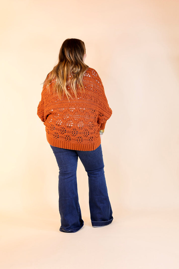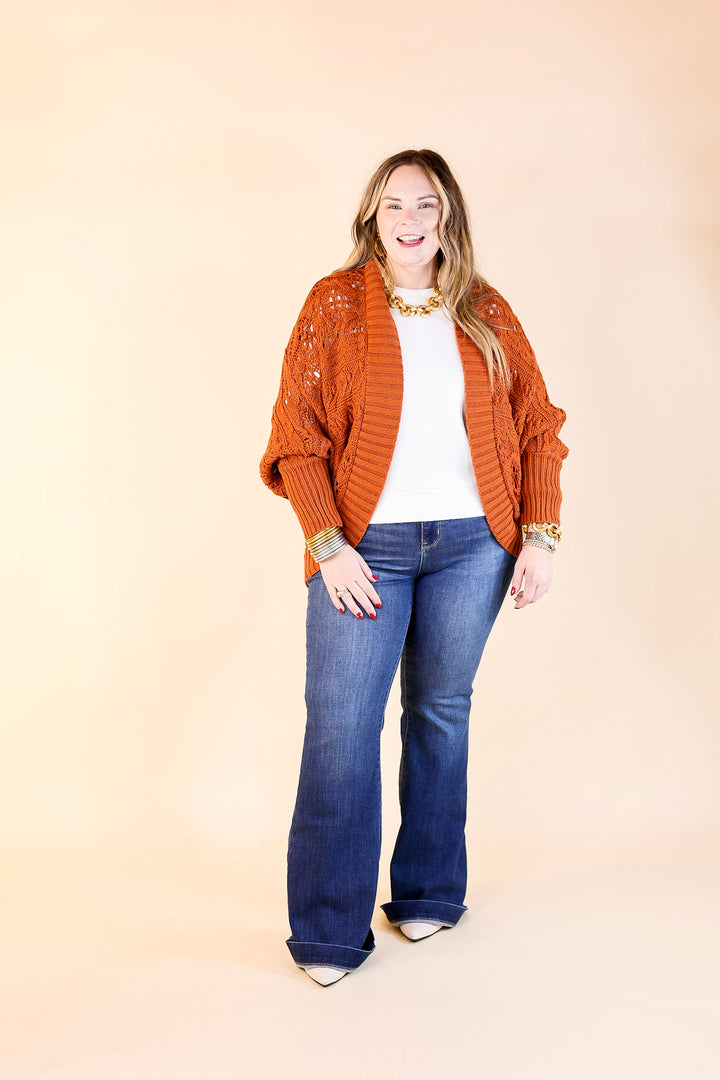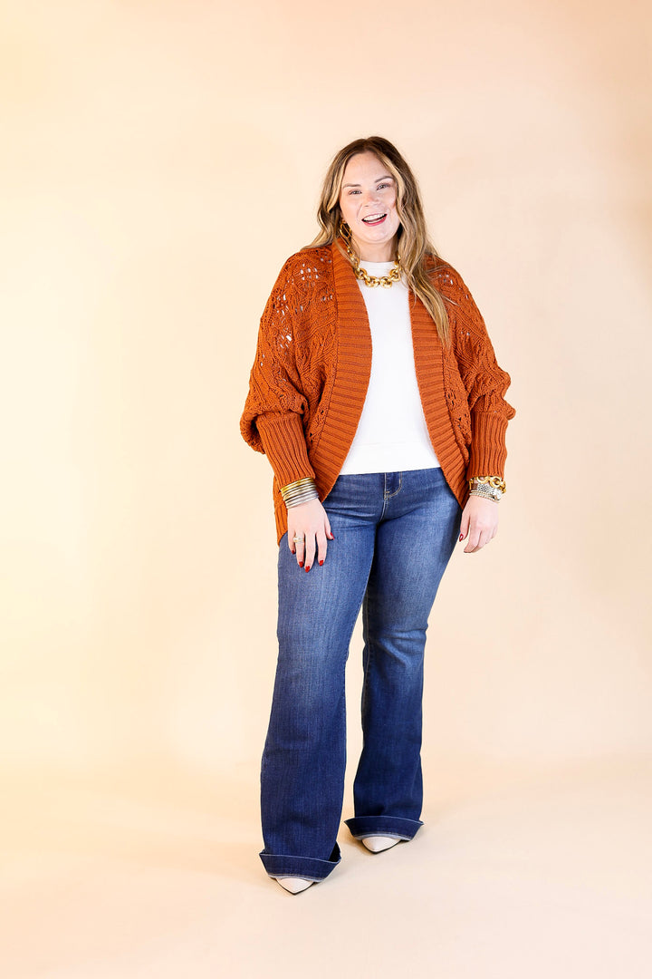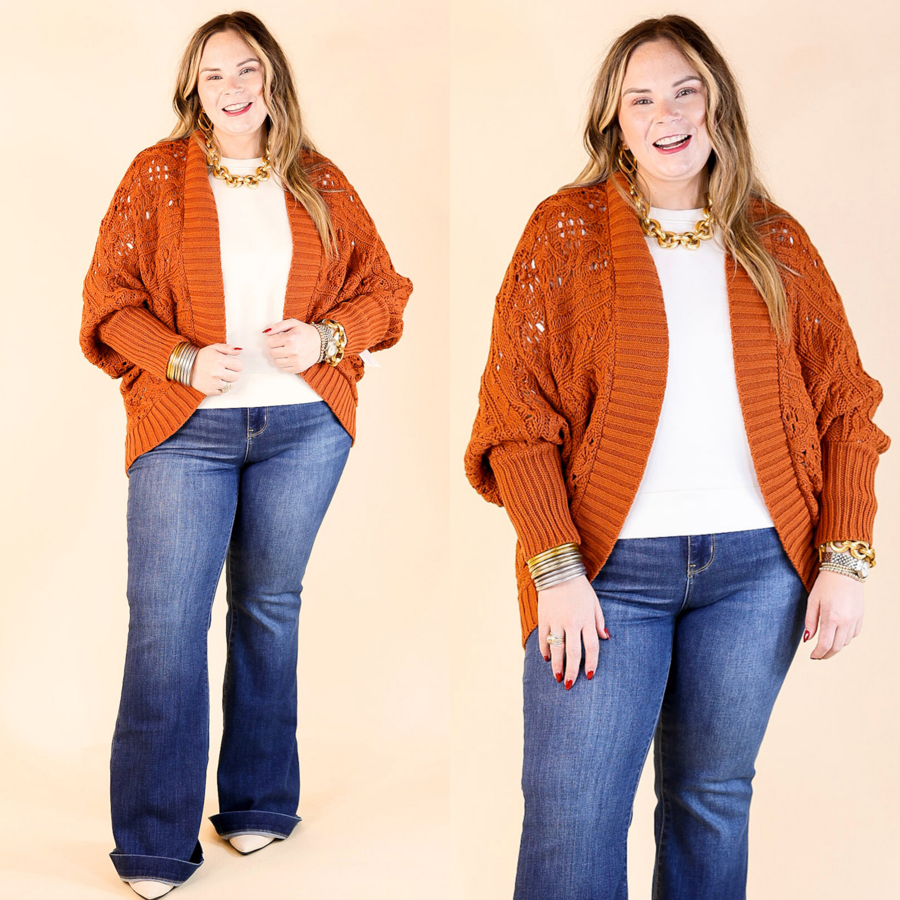 You will always be cozy in this adorable new cardigan! It includes an open front, long sleeves, dolman style long sleeves, and a rust cable knit material. This long cardigan is perfect to throw on over skinny jeans and a graphic tee!