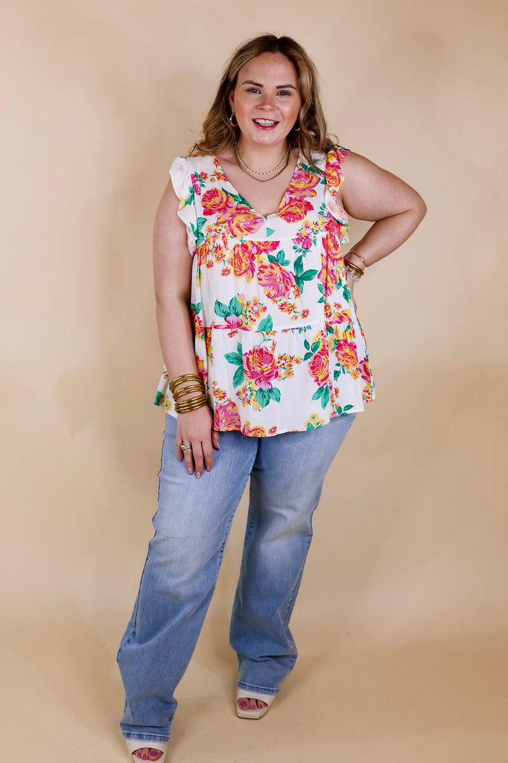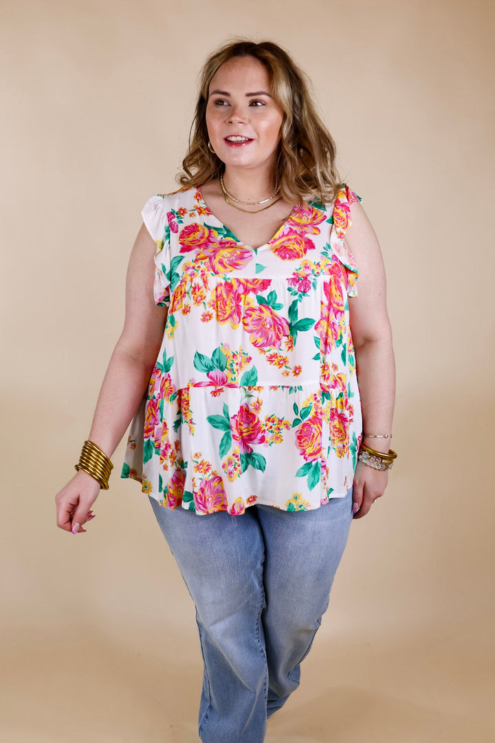 Inspiring Sights Floral V Neck Top with Ruffle Cap Sleeves in White