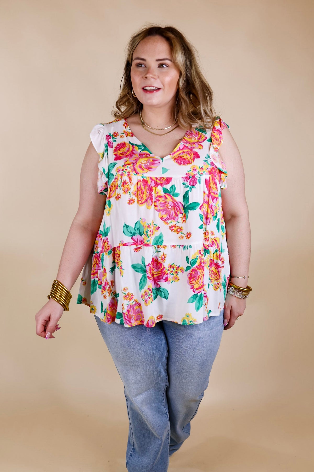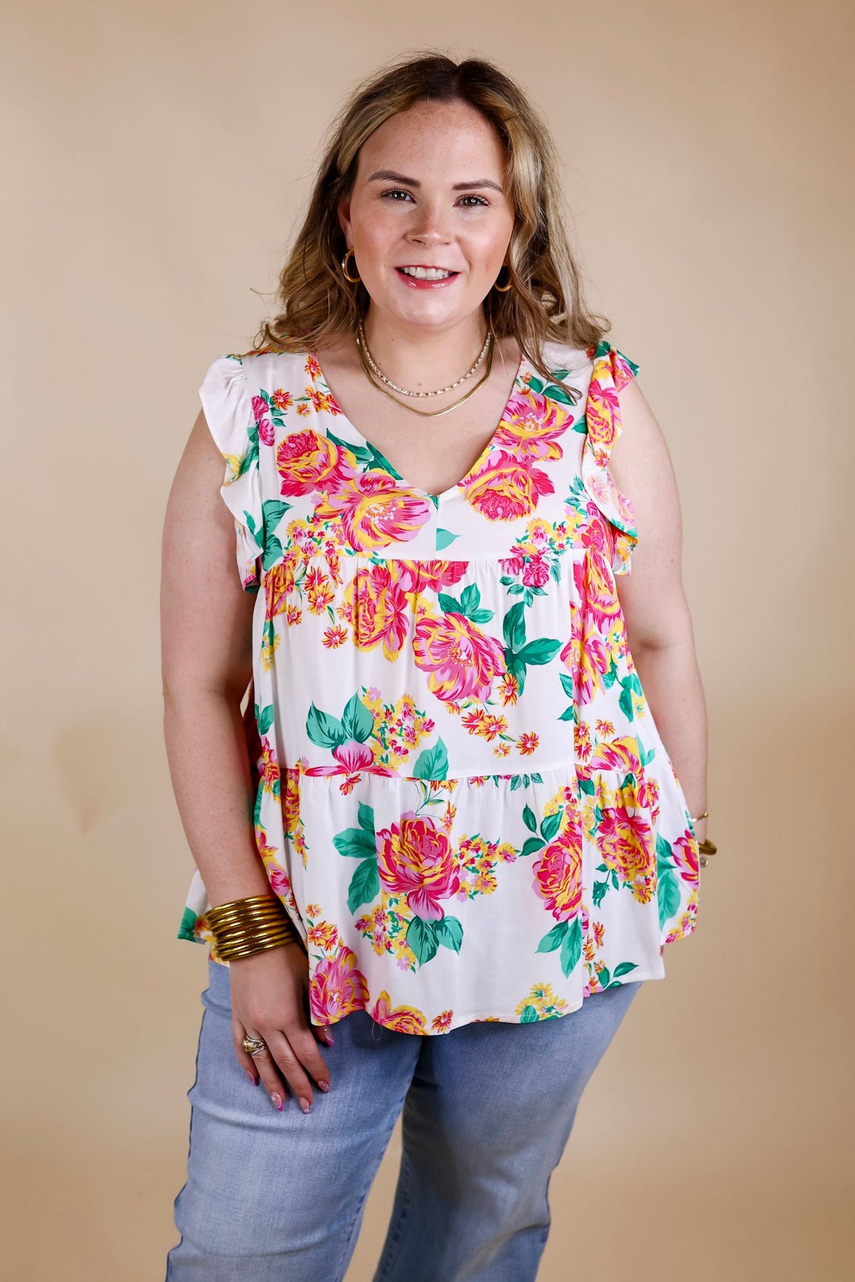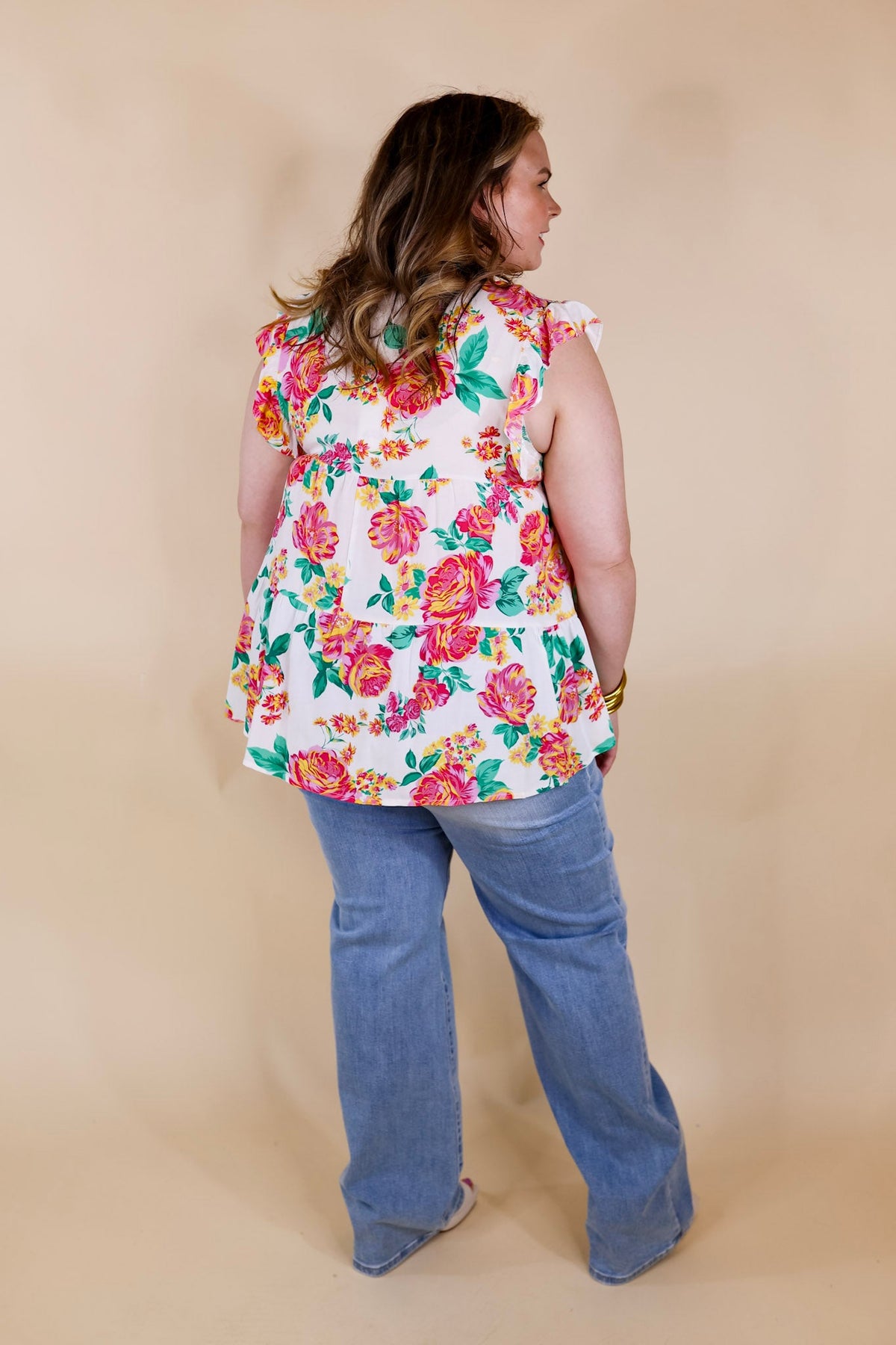 This adorable top is an inspiring sight! It includes a v neckline, tiered body, and ruffle cap sleeves. The floral pattern is a mix of pink, green, and yellow on a white background. Pair it with Judy Blue Jeans and sandals for a Spring time look!