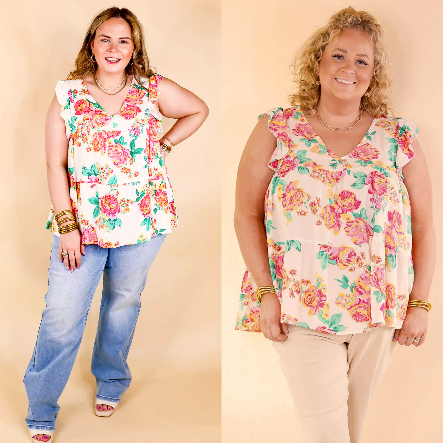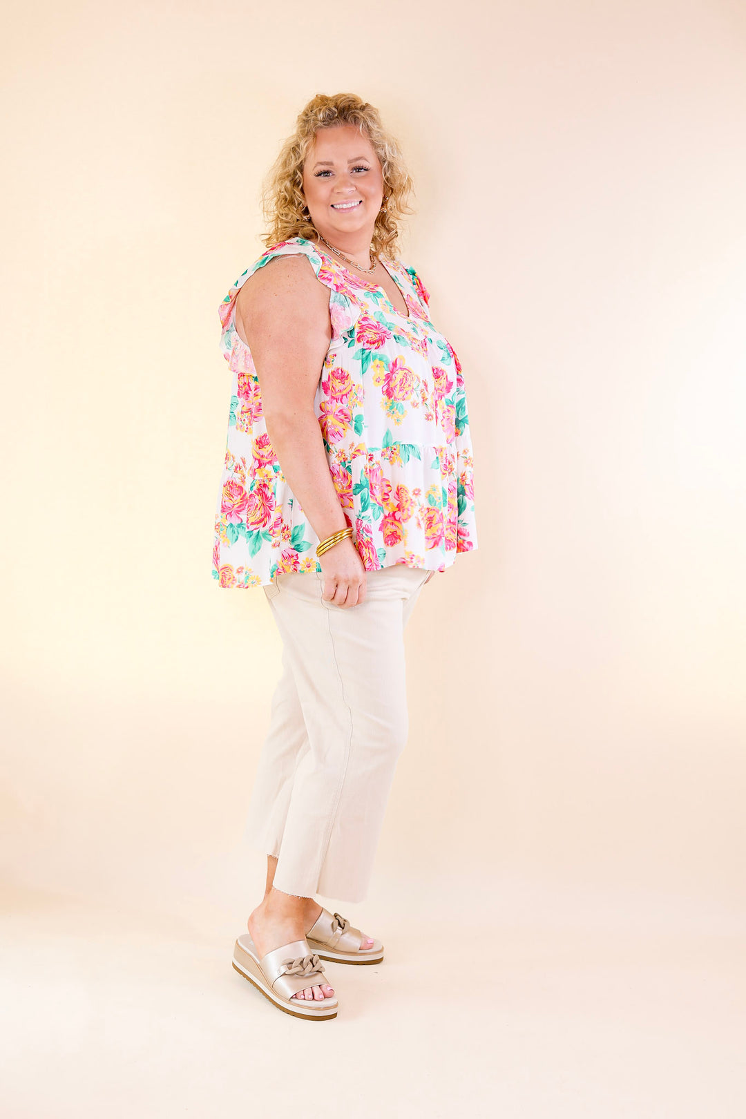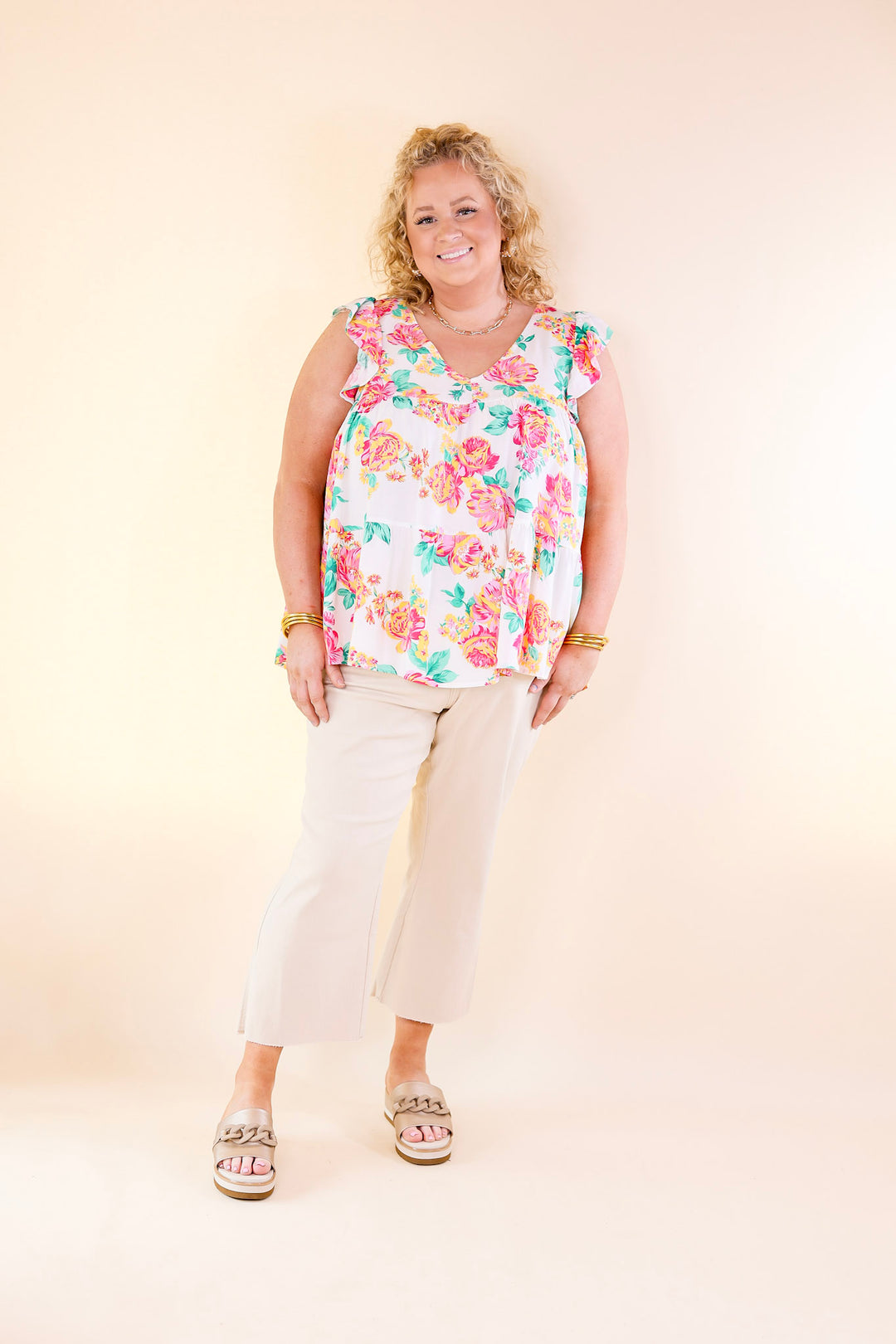 This adorable top is an inspiring sight! It includes a v neckline, tiered body, and ruffle cap sleeves. The floral pattern is a mix of pink, green, and yellow on a white background. Pair it with Judy Blue Jeans and sandals for a Spring time look!