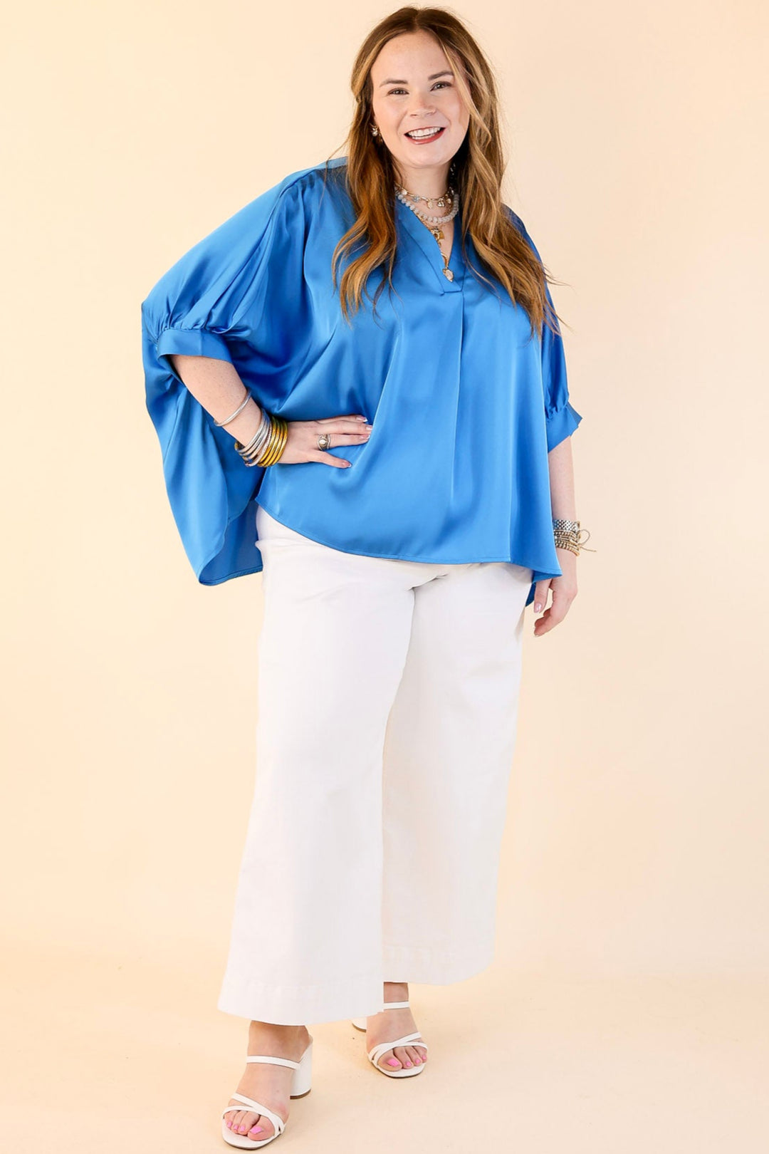 This delightful Irresistible Chic blouse is crafted from a lightweight fabric and features a classic V neck and oversized silhouette. The eye-catching rich blue shade is further complemented by a half sleeve and cuffed sleeve detailing for an alluring finish. Perfect for everyday or special occasions.