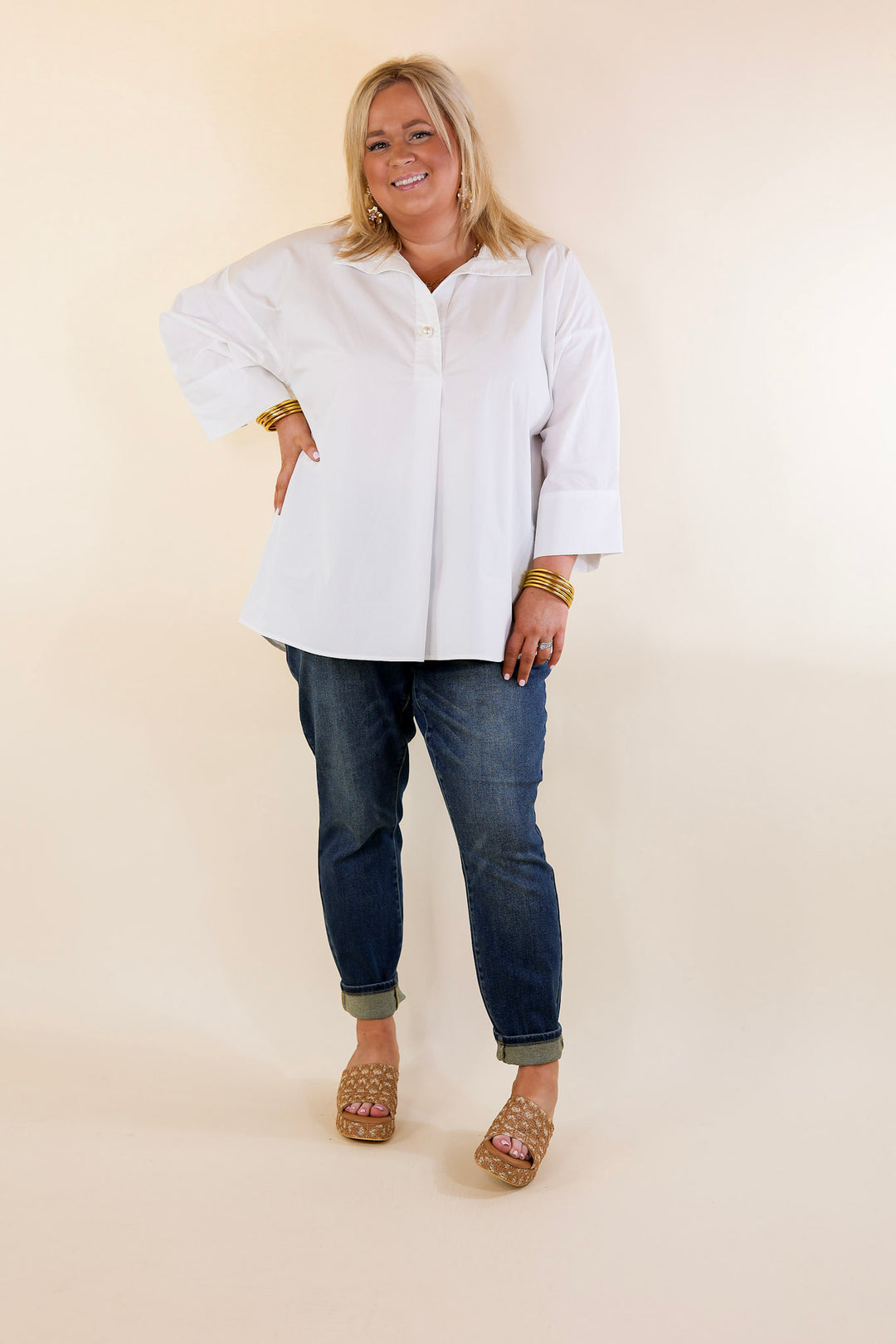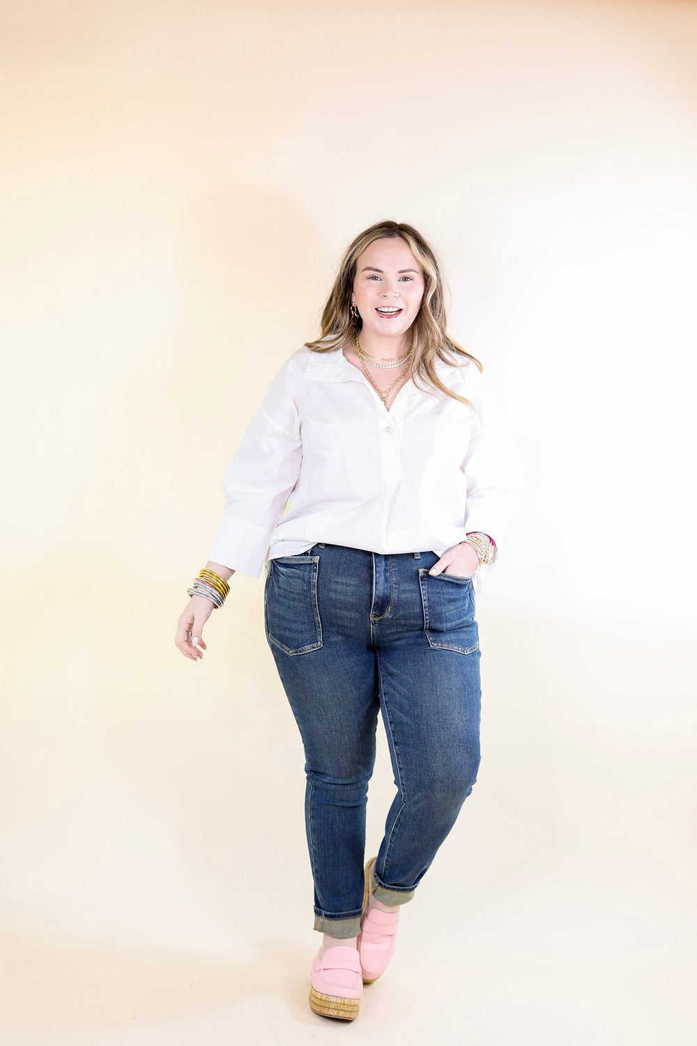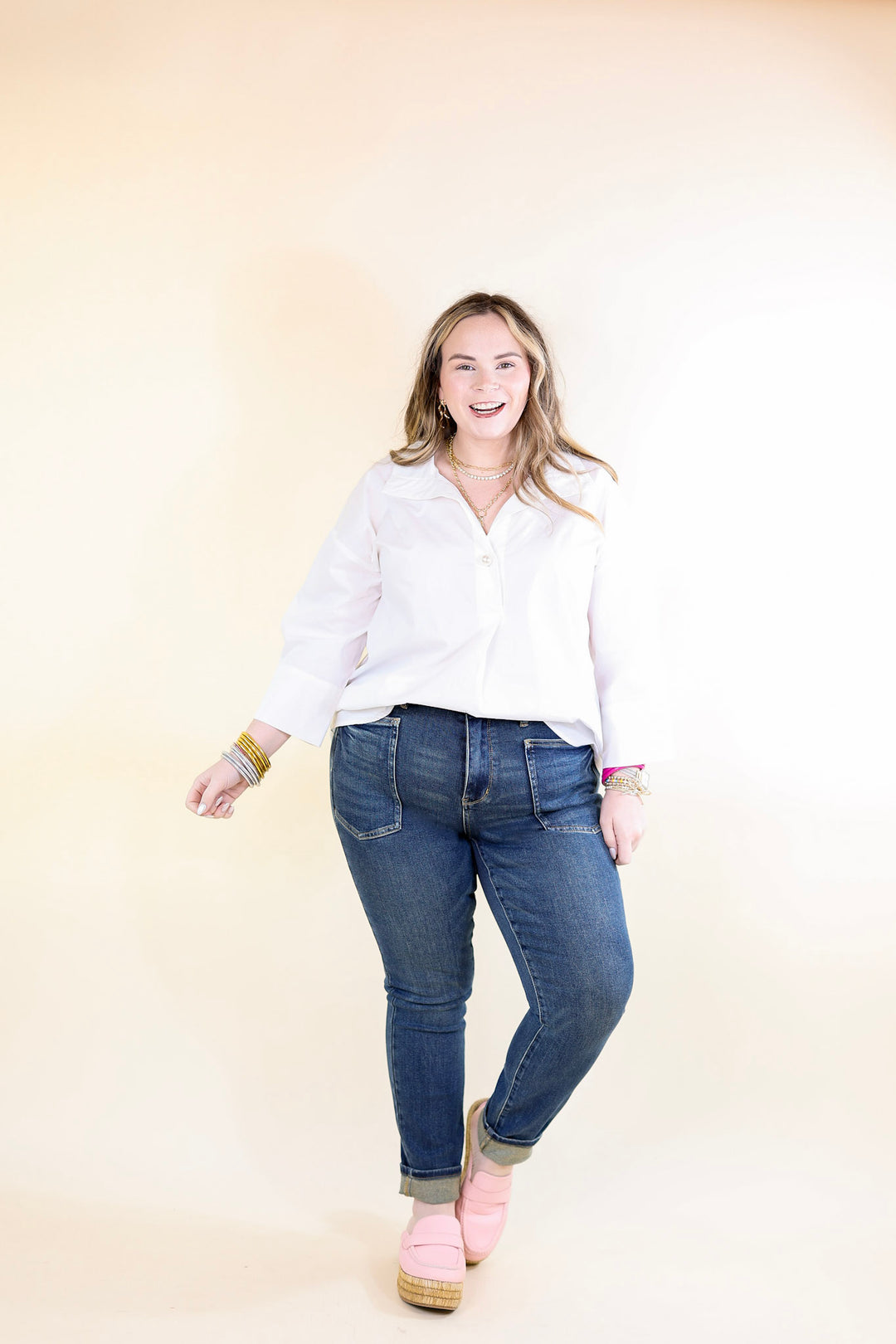 Model: Kristen is wearing a size 0/24. Abby is wearing a size 13/31. Maci is wearing a size 18W.