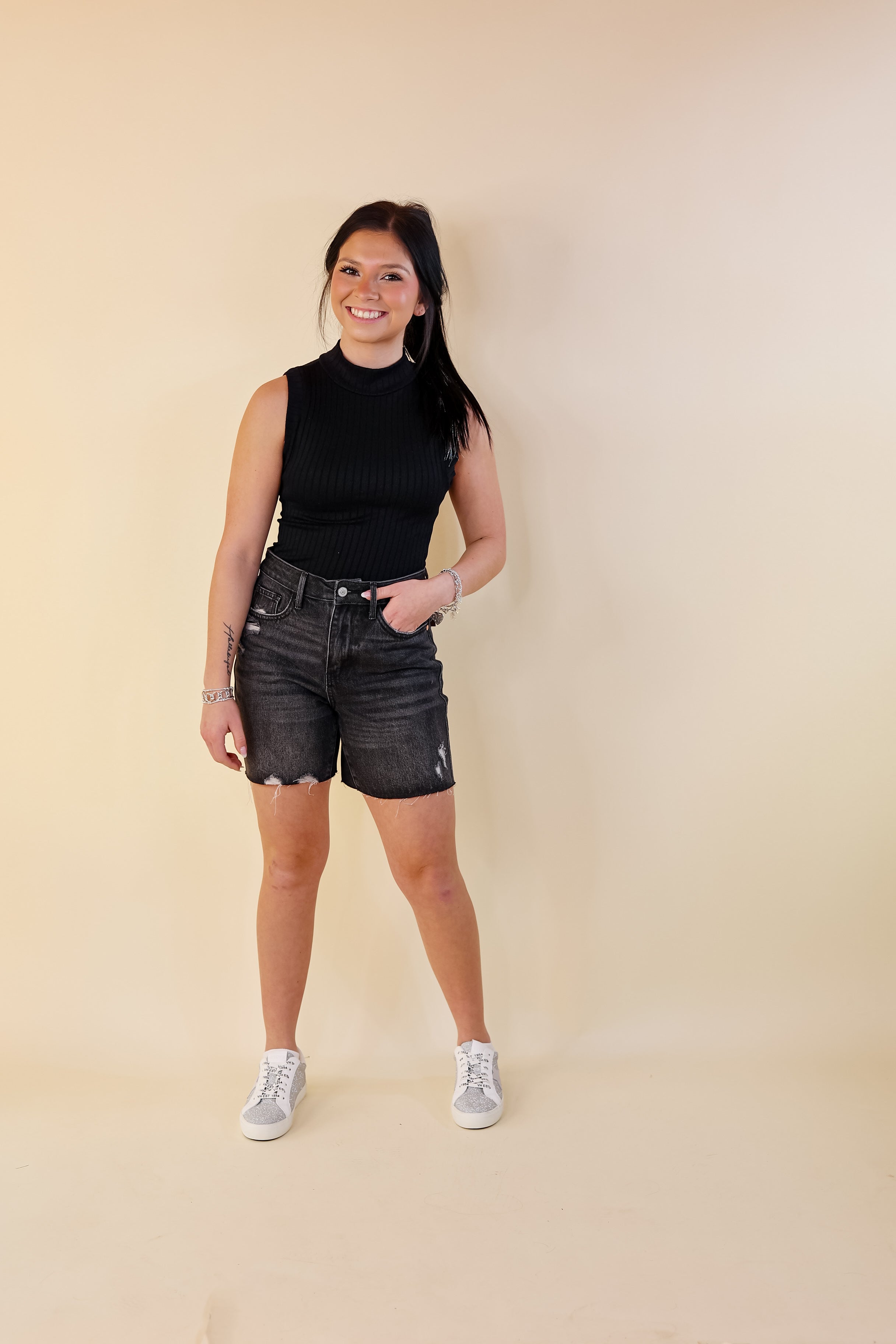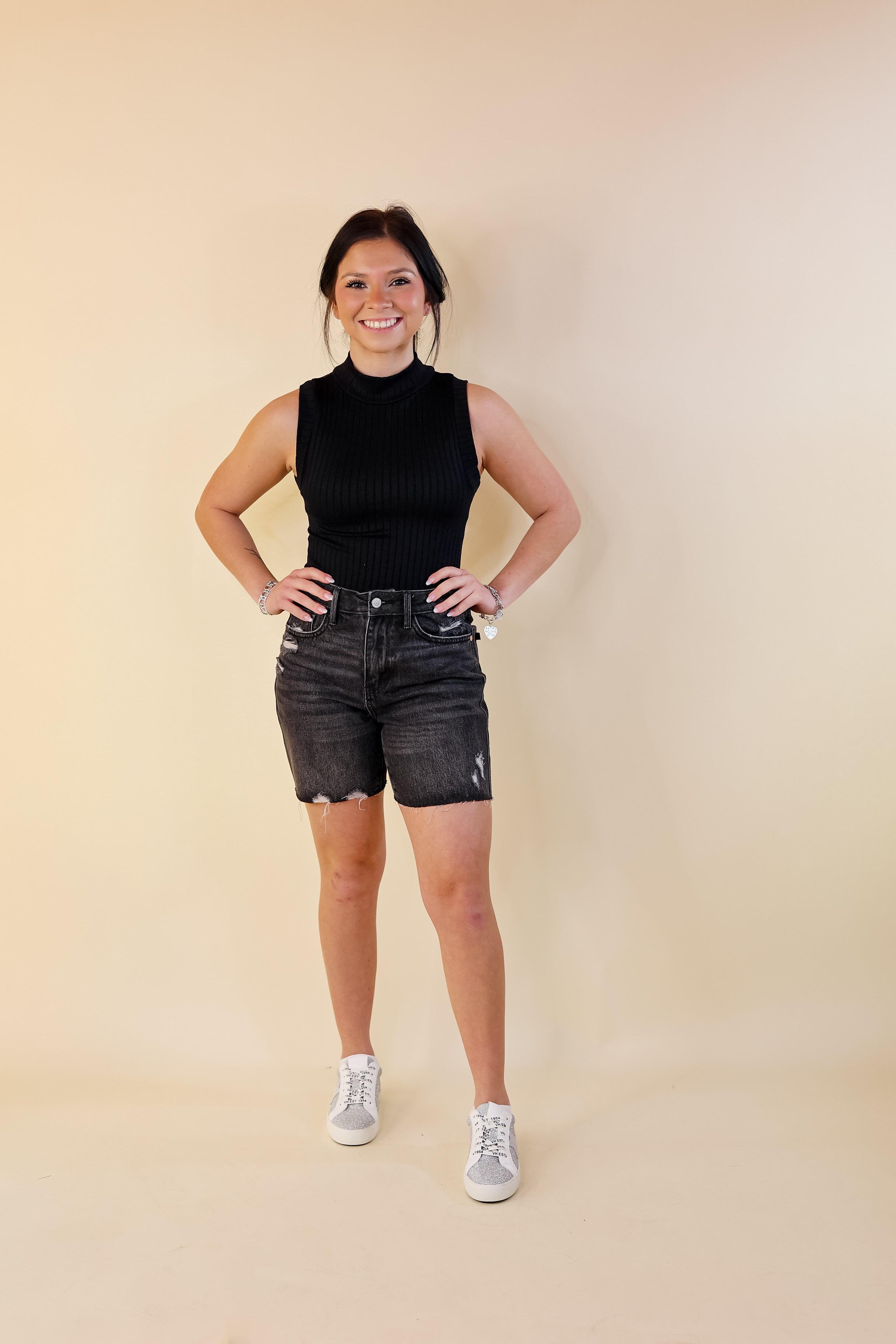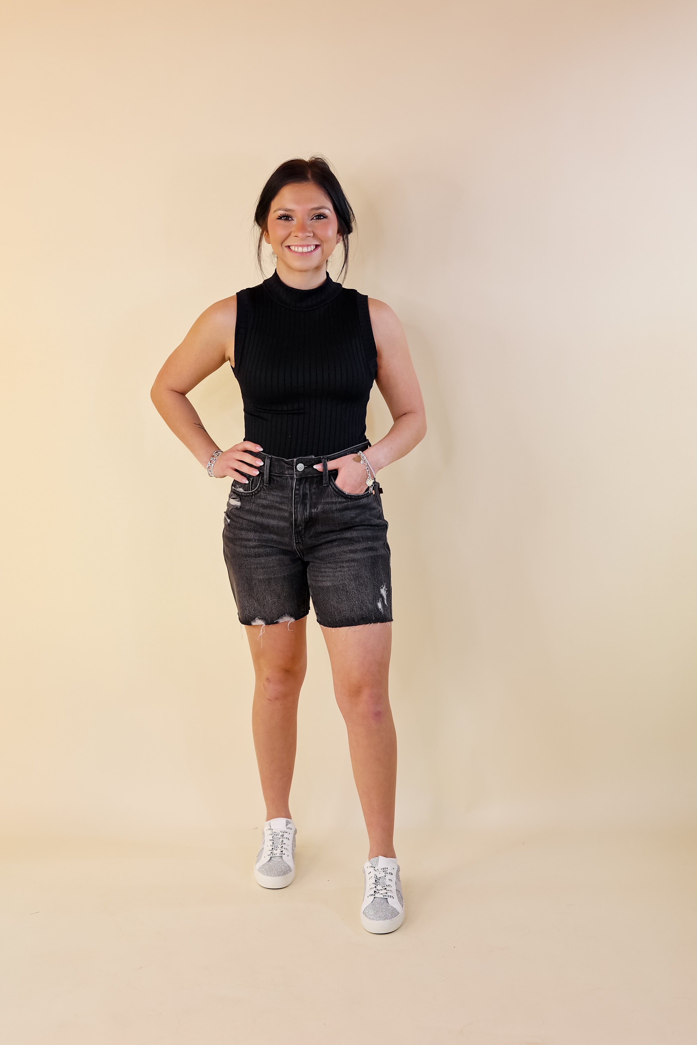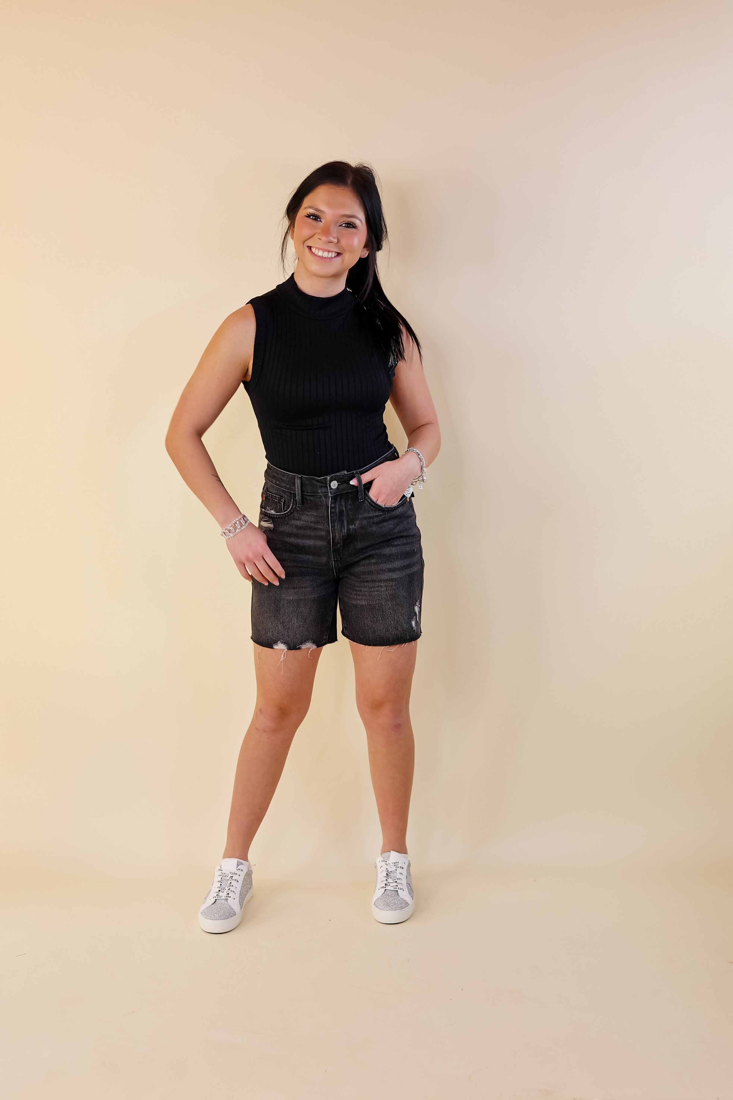 Judy Blue | Everyday Ease Rigid Magic Mid Thigh Raw Hem Shorts in Black Wash