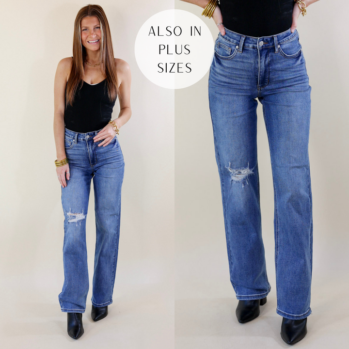 Step into the festival with Judy Blue's 90's Straight Leg Jeans. The classic straight leg fit flatters the figure, while the medium wash and destroyed knee add a modern edge. Feel confident and in control with the tummy control fit, and turn heads with these jeans all season long.