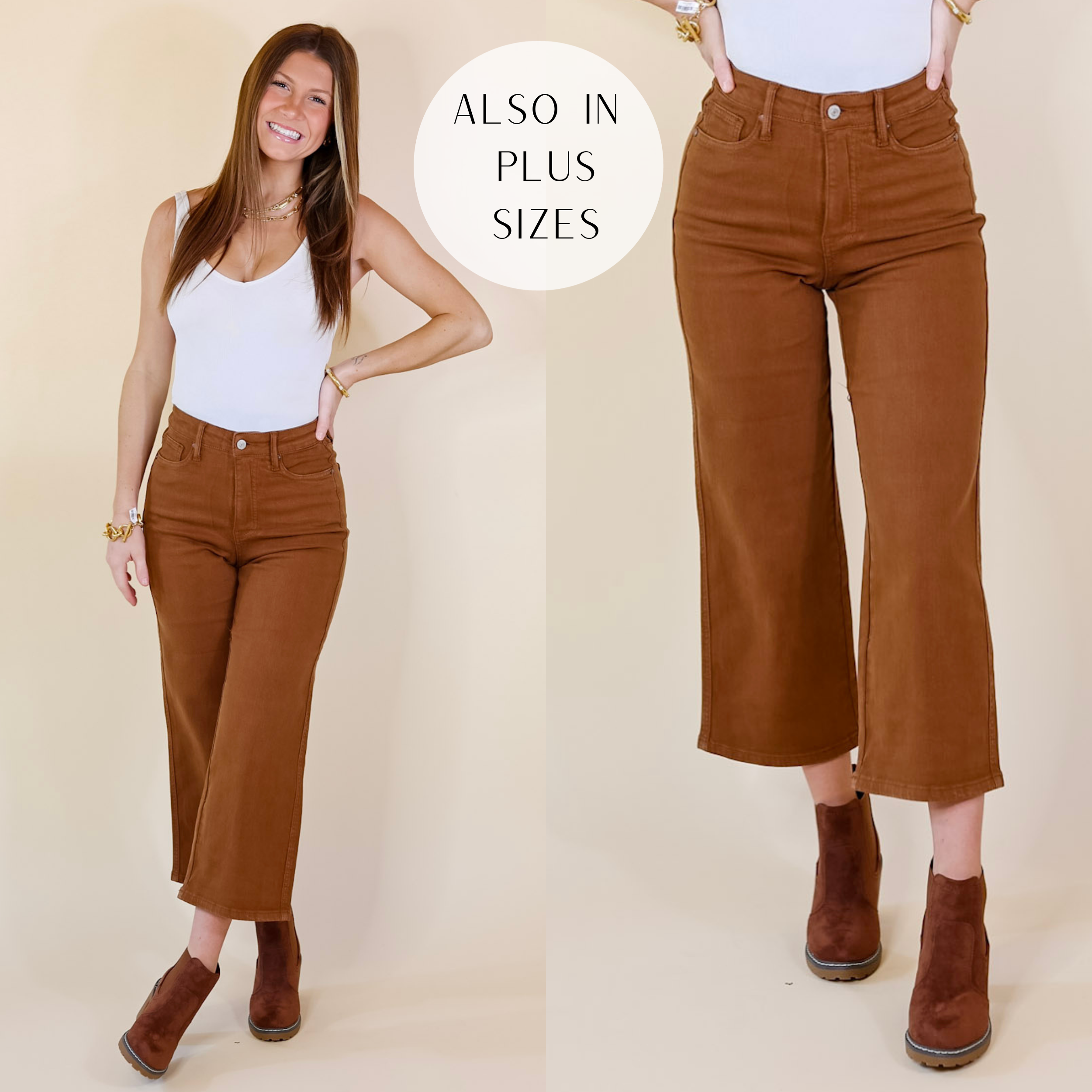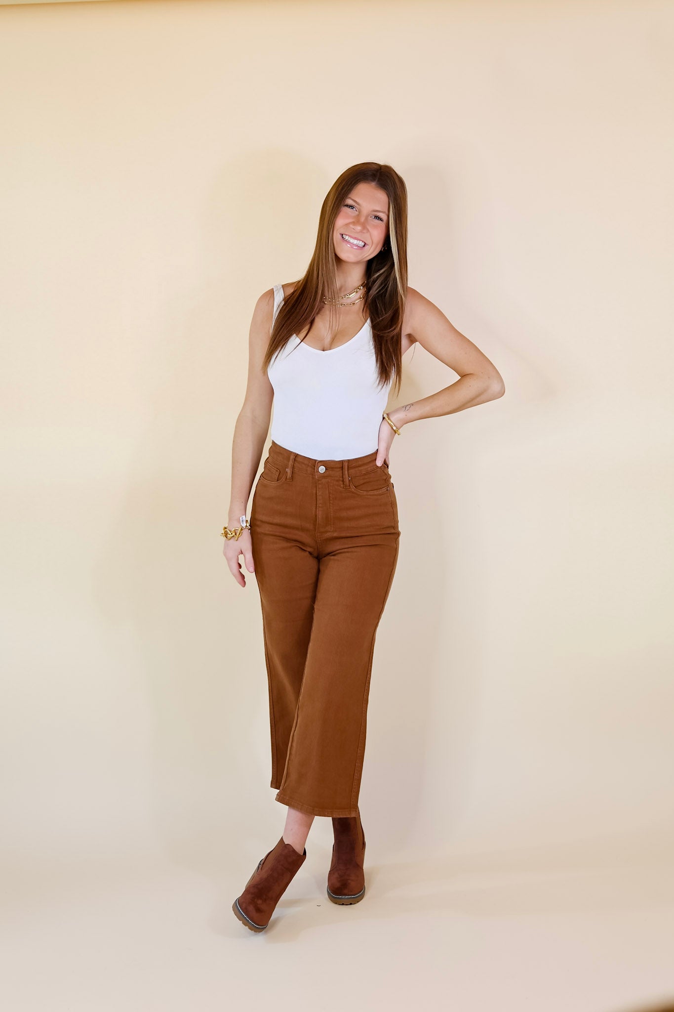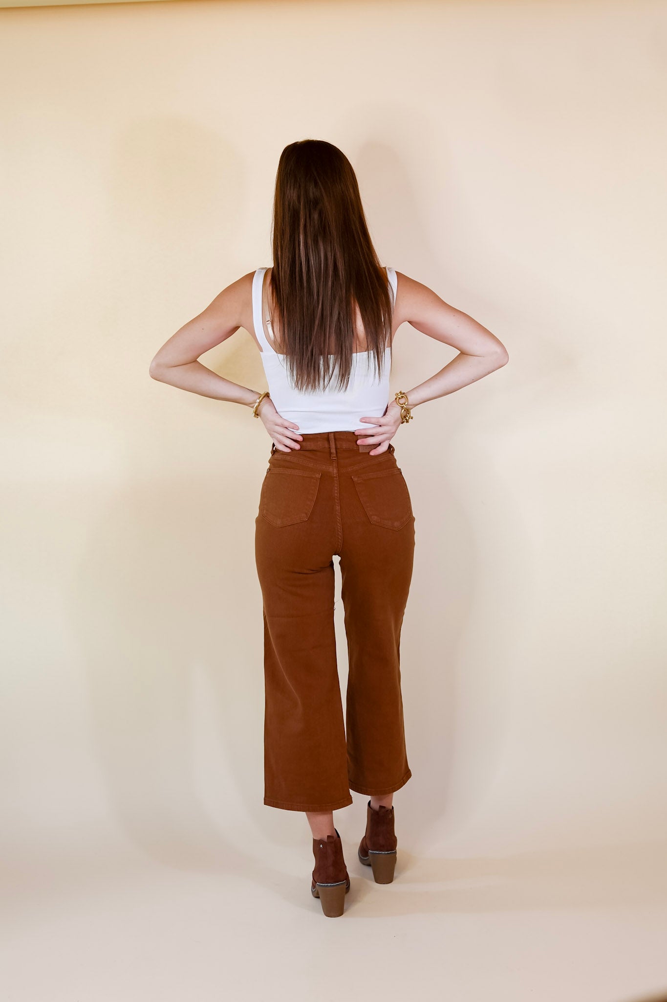 Last Chance Size 0, 1 & 15| Judy Blue | Sign Me Up Tummy Control Cropped Wide Leg Jeans in Camel Brown