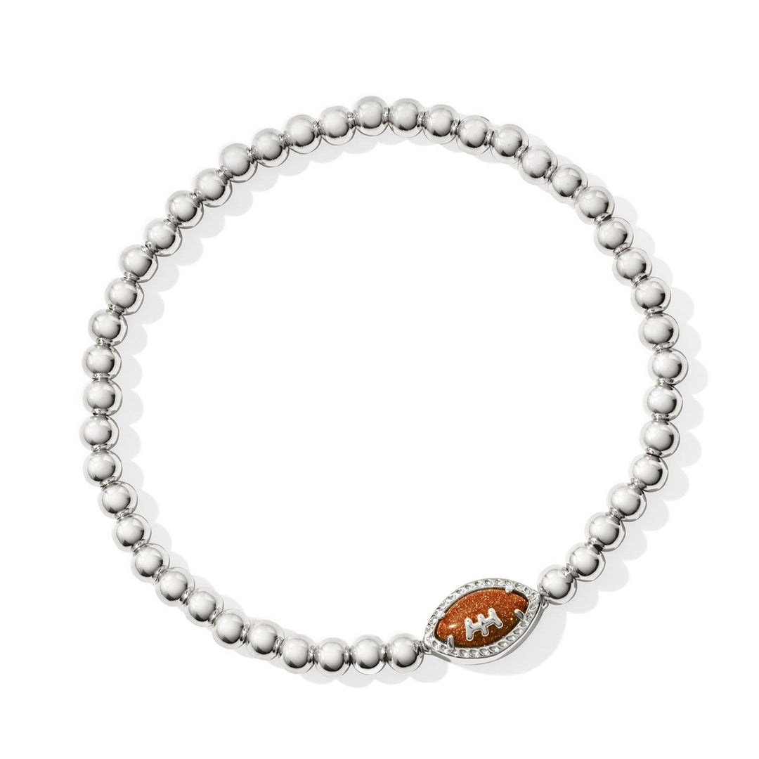 Our winning game plan? Styling the Football Silver Stretch Bracelet in Orange Goldstone all season long. A spirited football shape glitters in this beaded stretch bracelet style, adding a sporty touch to your gameday wrist stack. This style’s bound to be a bestseller like the matching Football Short Pendant Necklace, so snag one fast!