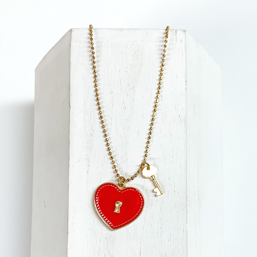 Key to My Heart Gold Tone Necklace with Gold Tone Key Charm and Red Heart Pendant