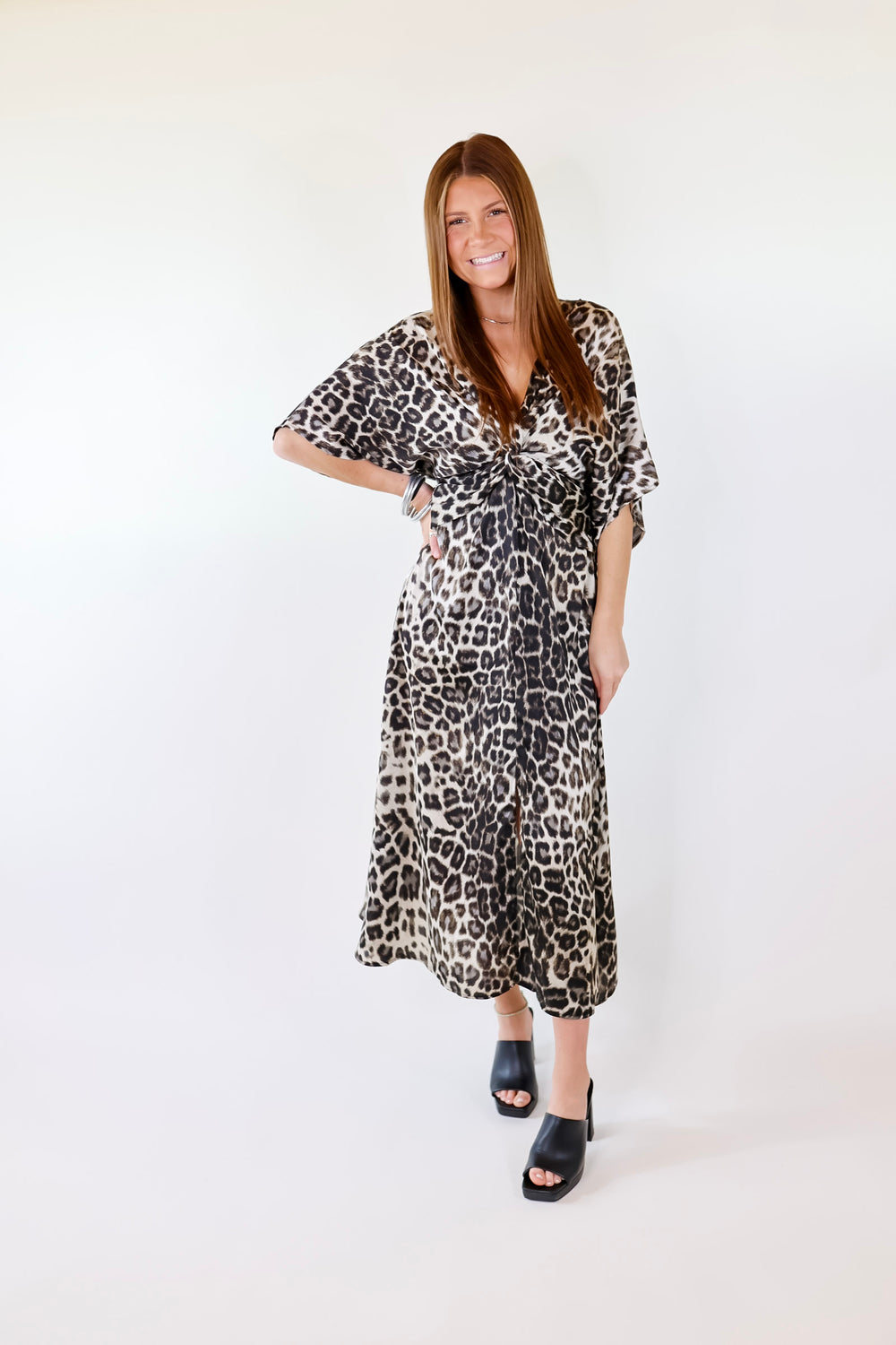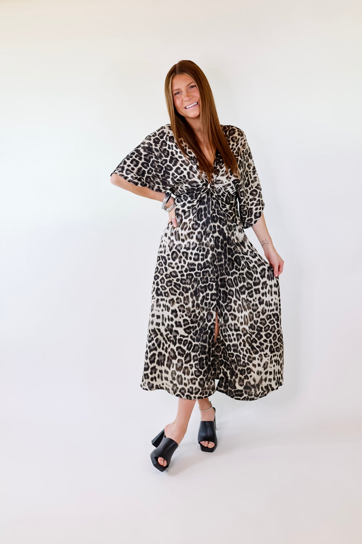 Take My Breath Away Front Knot Leopard Print Midi Dress in Grey
