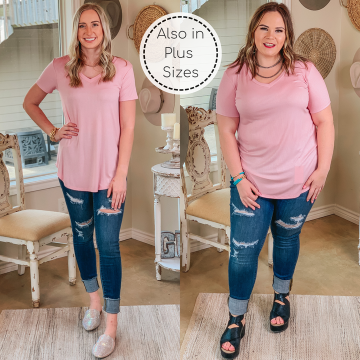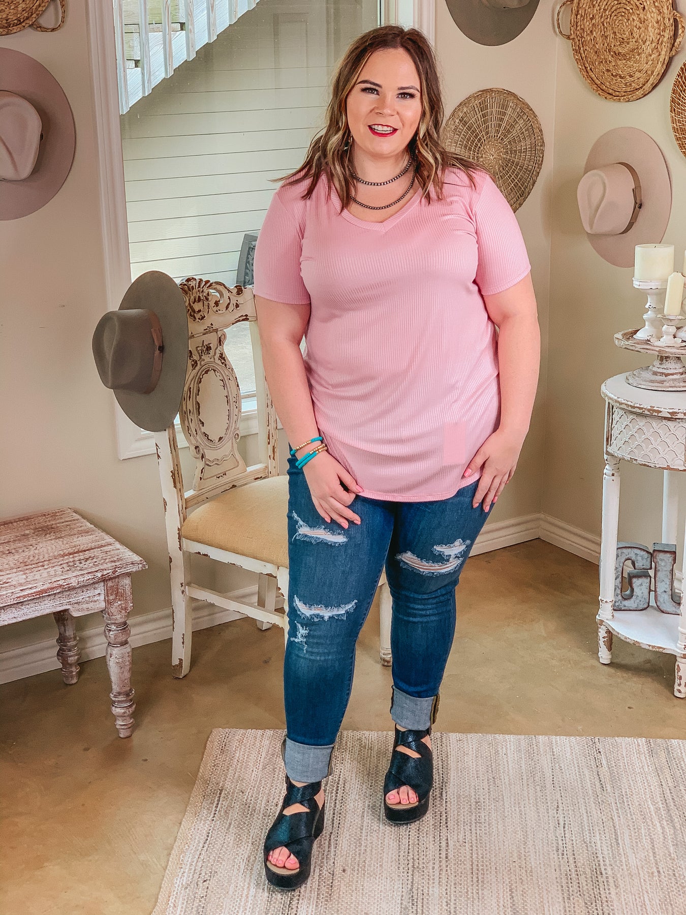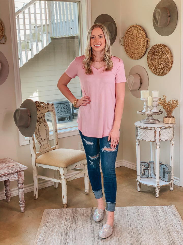 Simply Obsessed Ribbed Short Sleeve V Neck Top in Light Pink - Giddy Up Glamour Boutique