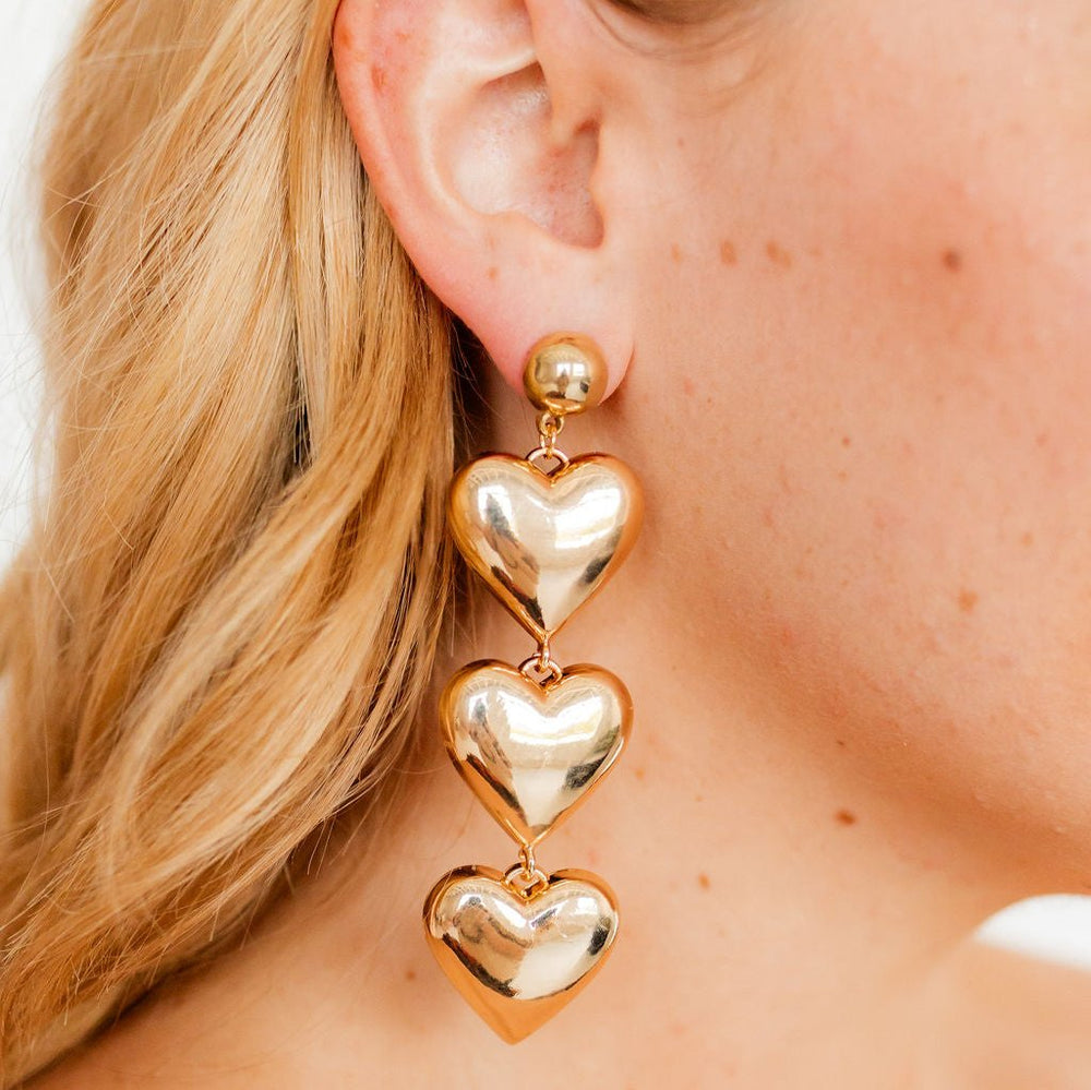 Introducing the Linny Co Brynn Gold Tone Heart Drop Earrings, the perfect blend of elegance and fun. Crafted from 100% surgical-grade stainless steel, these earrings are safe for sensitive ears, lightweight, and made to last. Featuring three cascading hearts and measuring 95mm long, Brynn makes a bold statement with its shiny, slightly reflective finish. Like all Linny Co jewelry, these earrings are copper and nickel free, ensuring both comfort and style. Add a playful touch to your accessory collection with the Brynn Gold Tone Heart Drop Earrings.