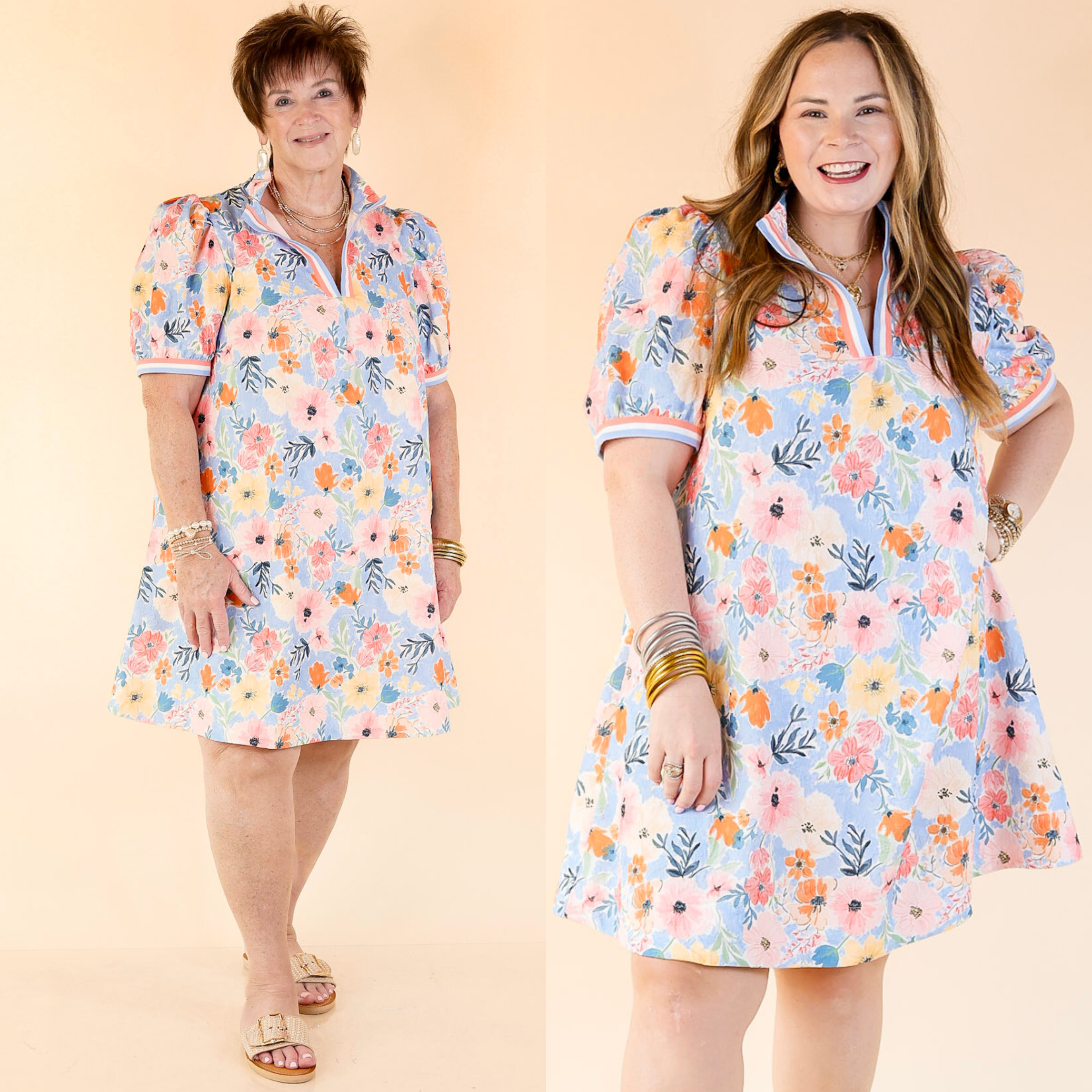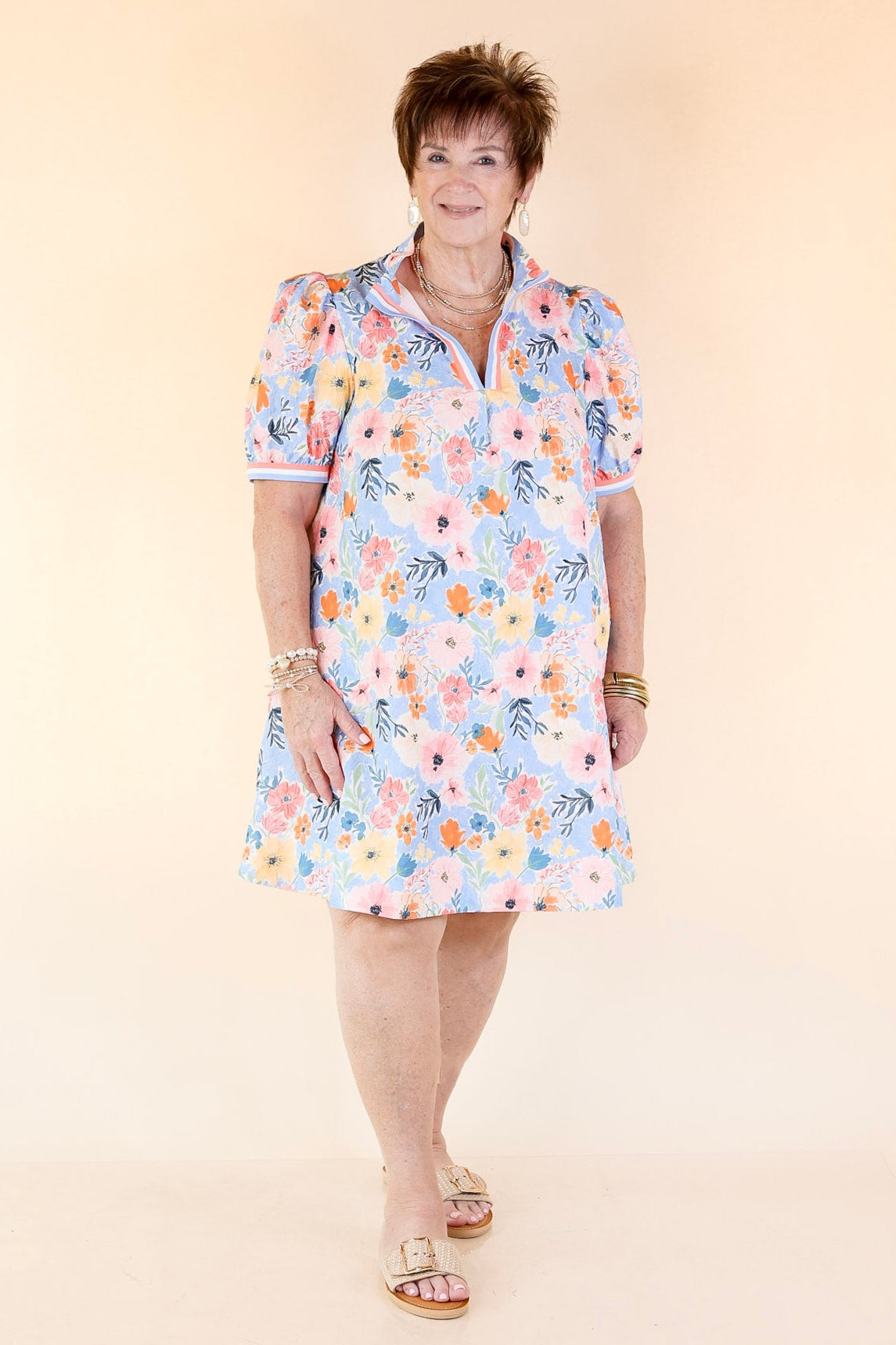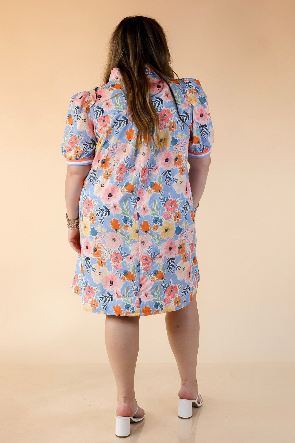 The Lovely as Ever dress lives up to its name—elegant, effortless, and made to turn heads. This floral print dress features a flattering high neck with a subtle V neckline, short puff sleeves, and contrast stripe band trim for a polished finish. The lightweight fabric and easy silhouette make it perfect for everything from baby showers to brunch dates. Dress it up with wedges or keep it casual with flats—either way, you’ll look lovely as ever.