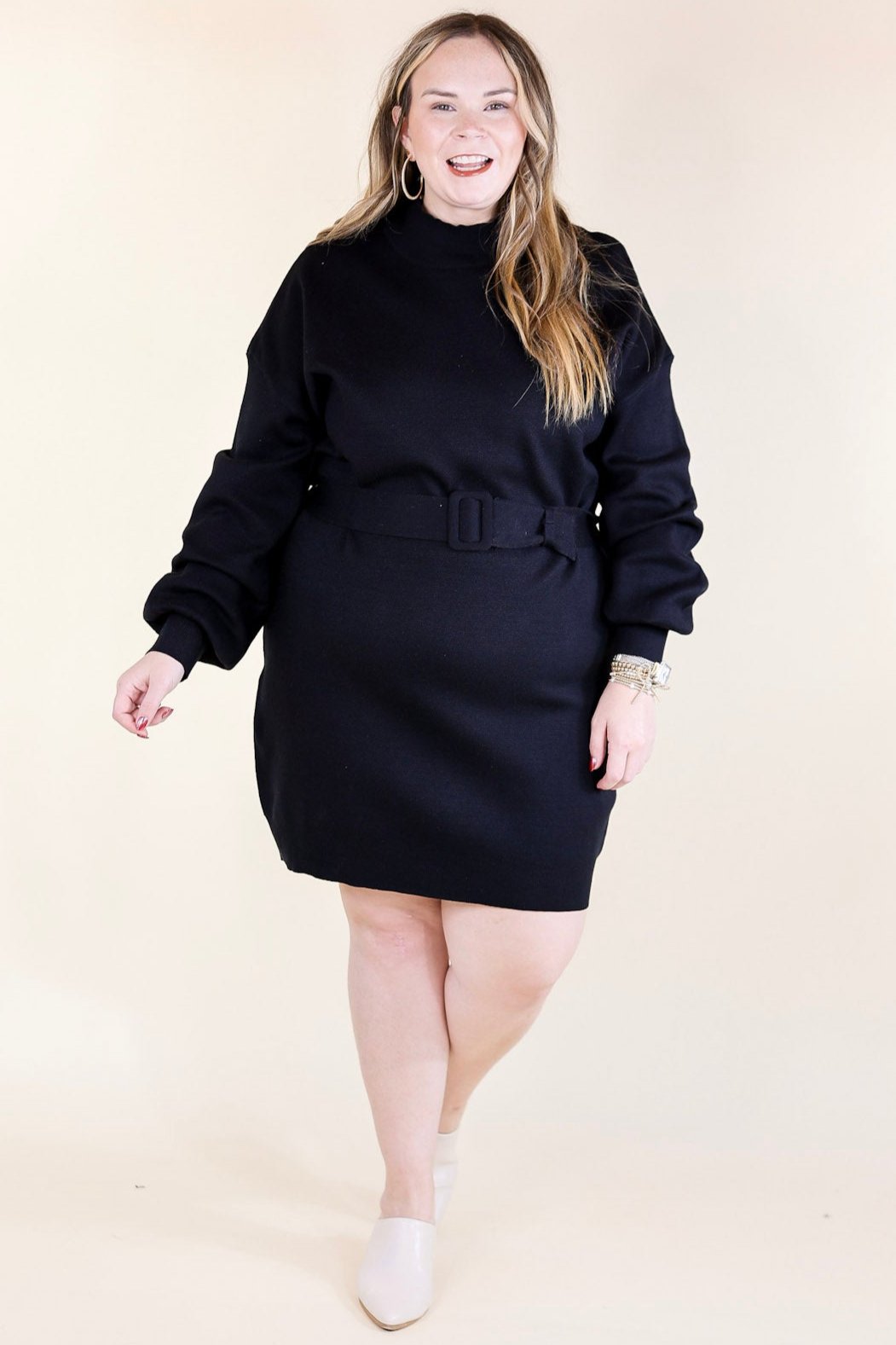 Add a touch of luxury to your life with this black sweater dress. Constructed with a plush sweater material, this dress features long sleeves, a mock neckline, and a coordinating belt for an ultra-chic look. Feel warm, comfortable, and luxuriously fashionable in this delightful dress.