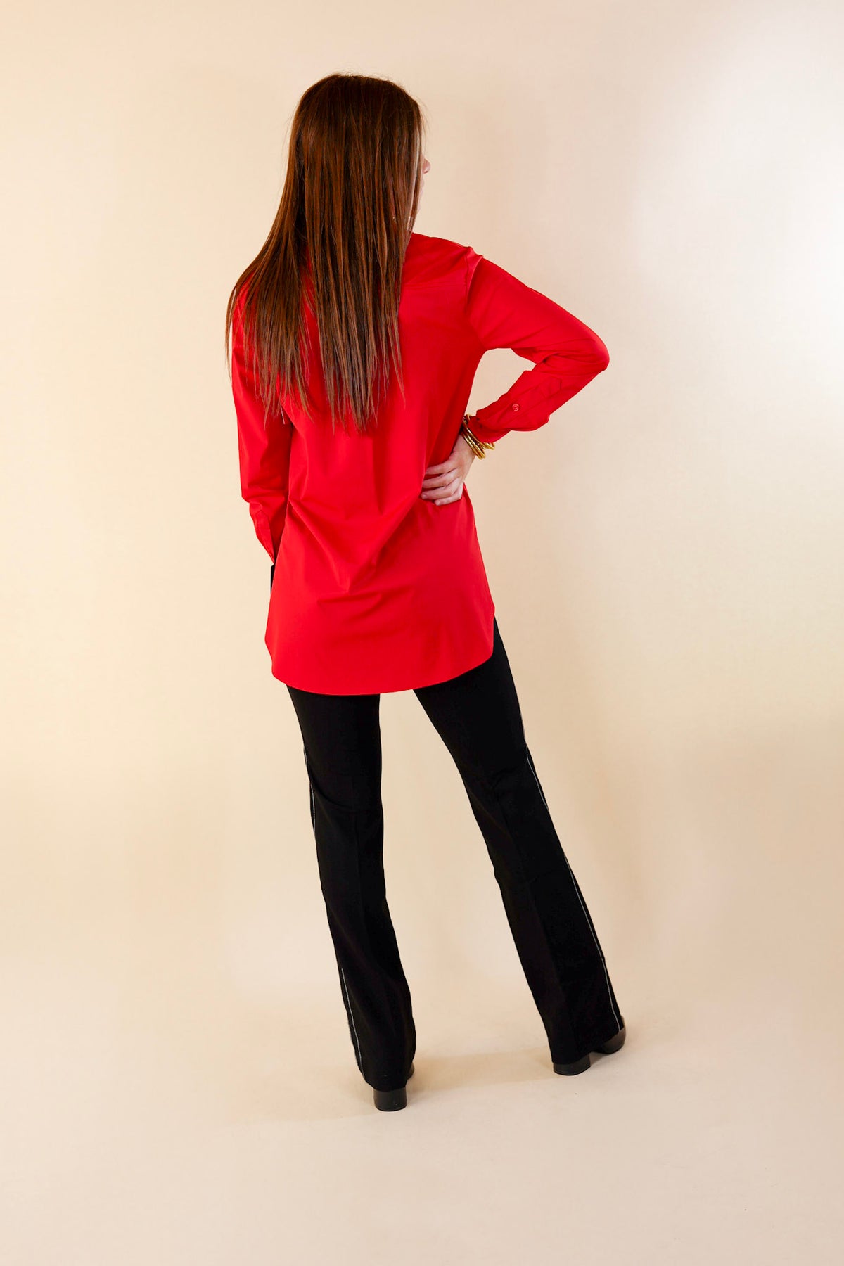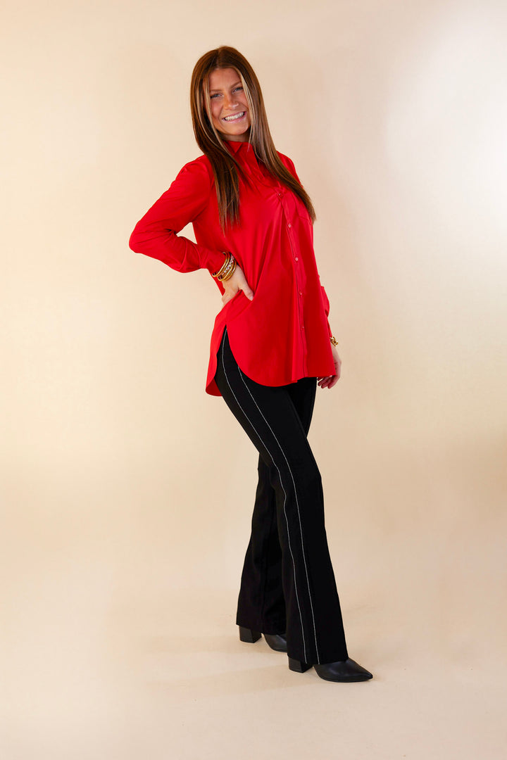 The Elysse Wide Leg features a concealed patented waistband, washable, 4-way stretch fabric, front pintucks and classic styling. Skimming the waist and hips before falling into fit-and-flair leg, these on-trend bottoms complement fitted tops, heeled mules and cropped jackets. Arté is wearing a size small.
