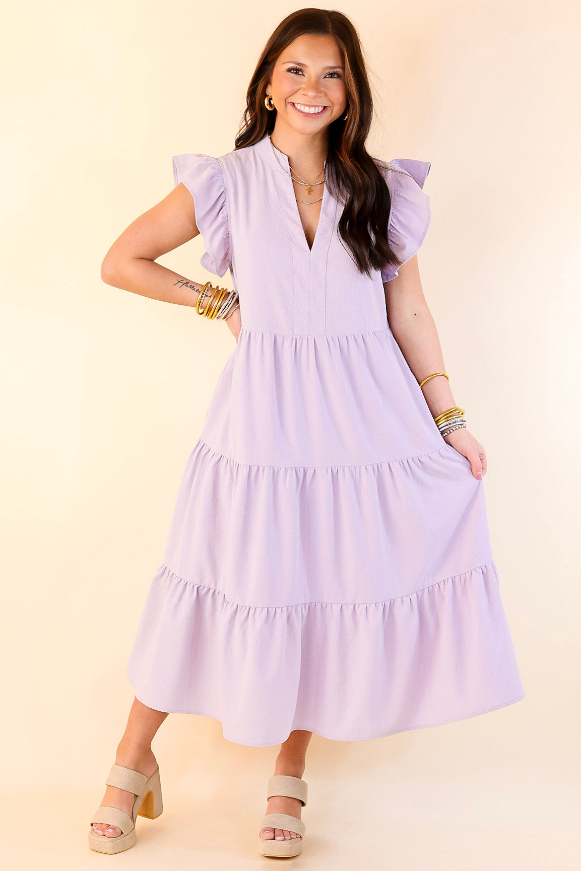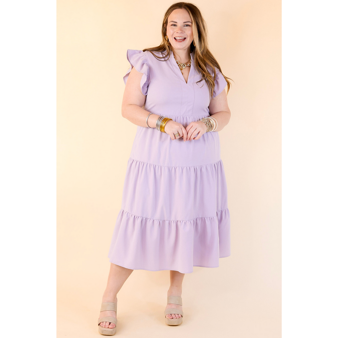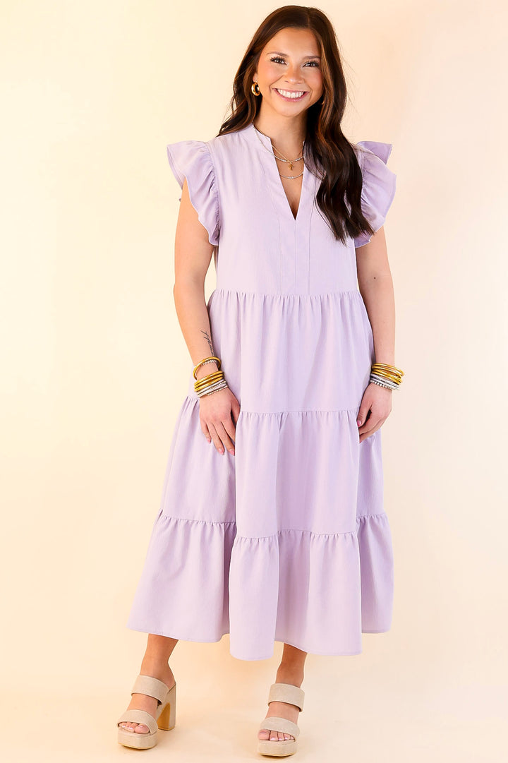 Magnolia Morning Ruffle Cap Sleeve Tiered Midi Dress in Lavender Purple