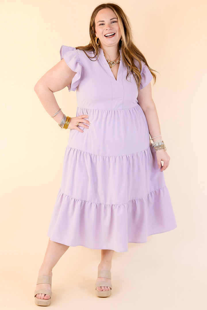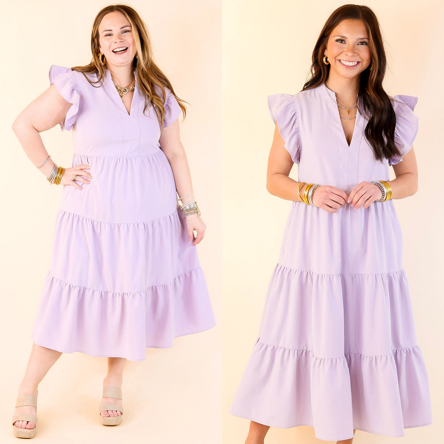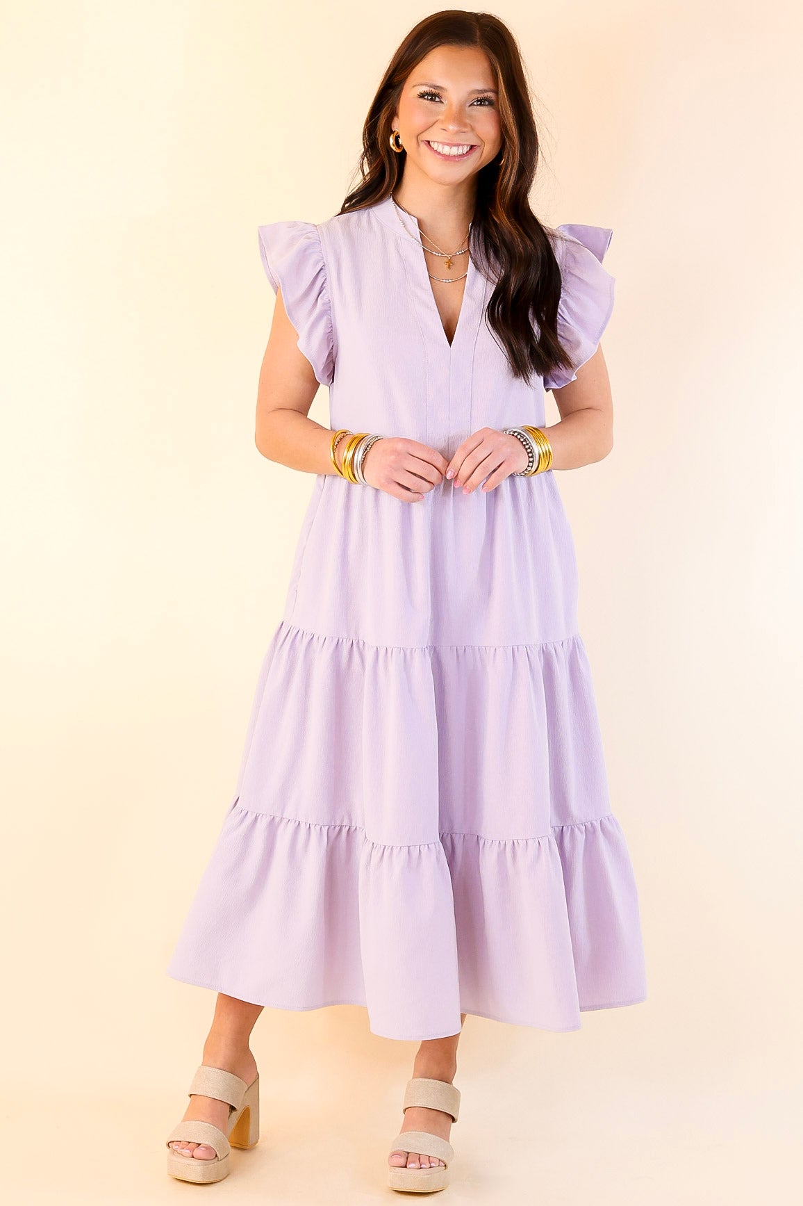 Magnolia Morning Ruffle Cap Sleeve Tiered Midi Dress in Lavender Purple