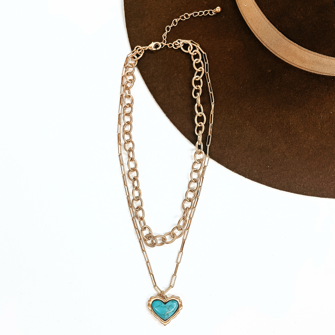 Mostly In Love Matte Gold Tone Two Strand Layering Necklace with Faux Turquoise Heart Pendant