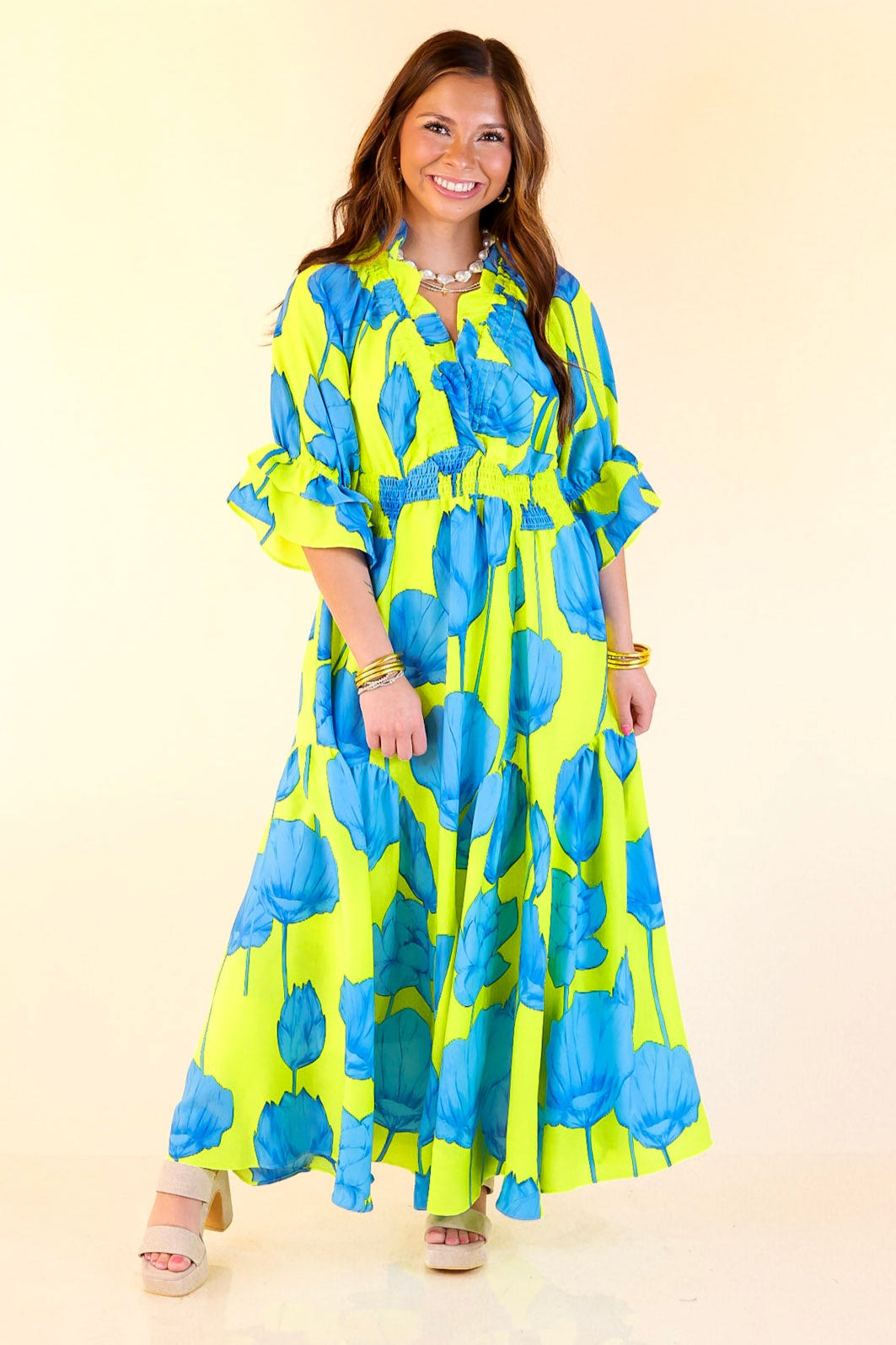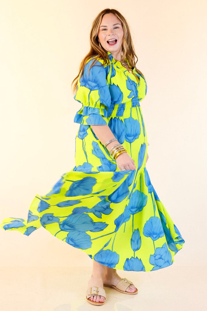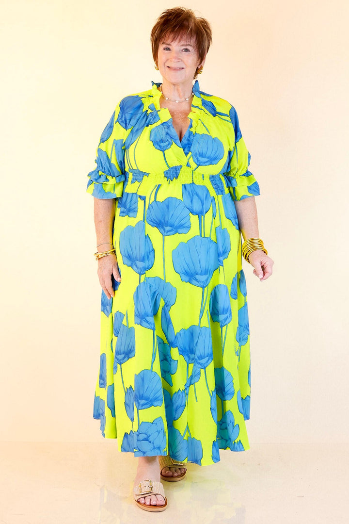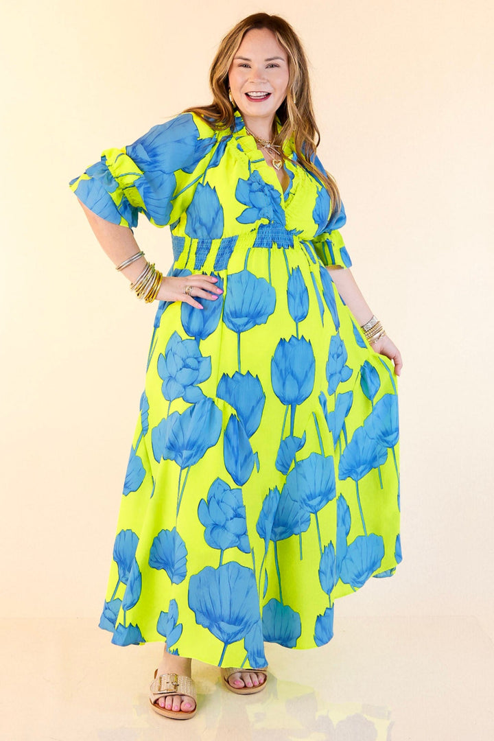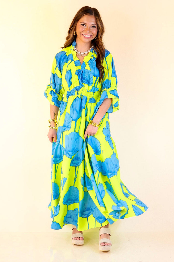 Bright, bold, and bursting with charm—the Breezy Belle maxi is your go-to for sunshine and compliments. With a Blue Lime floral print, ruffle puff sleeves, a flirty V-neckline, and a ruffled collar, it’s sweet with a twist. The smocked waist adds shape while keeping things comfy, and the flowy maxi length brings all the dreamy movement. Perfect for summer weddings, weekend getaways, or any moment worth dressing up for.