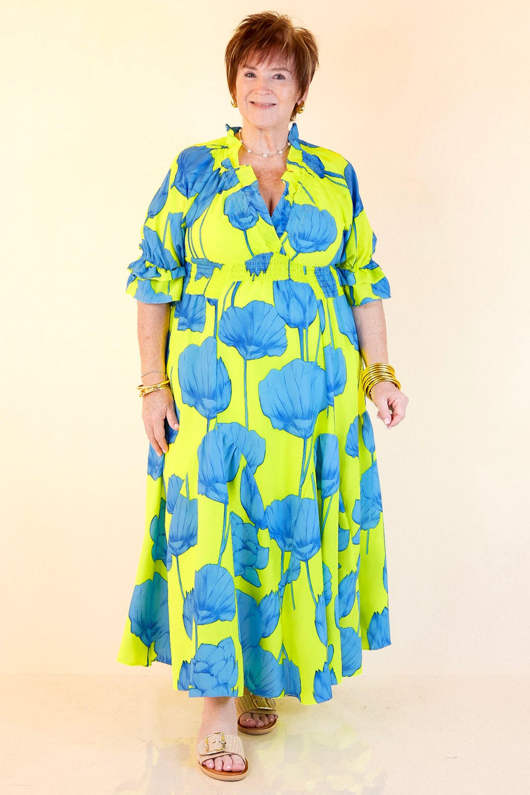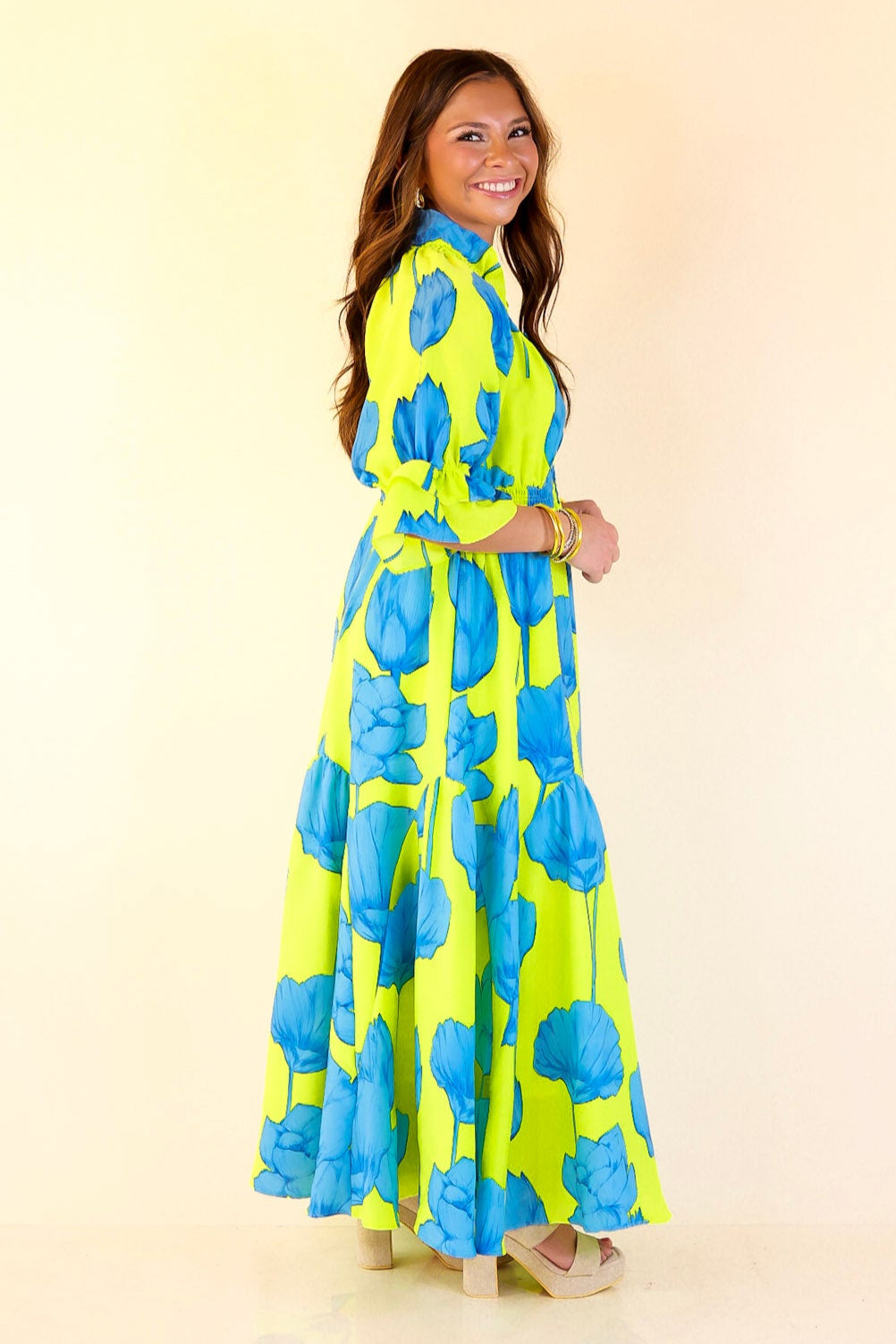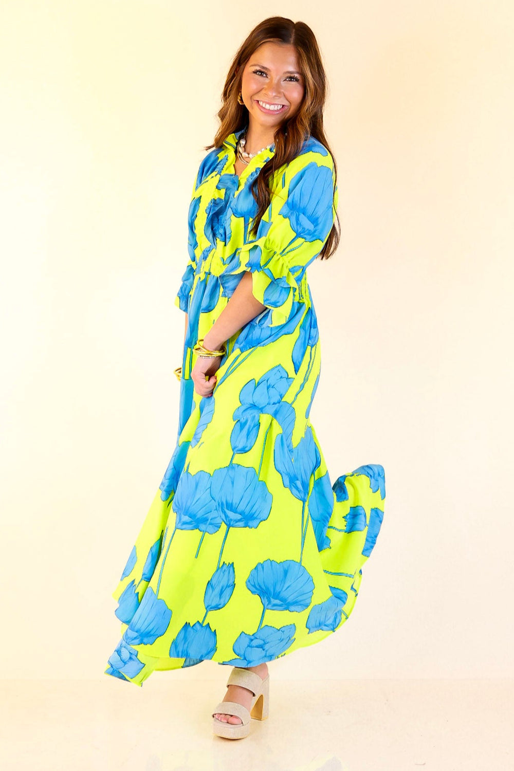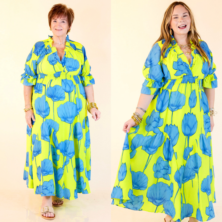 Bright, bold, and bursting with charm—the Breezy Belle maxi is your go-to for sunshine and compliments. With a Blue Lime floral print, ruffle puff sleeves, a flirty V-neckline, and a ruffled collar, it’s sweet with a twist. The smocked waist adds shape while keeping things comfy, and the flowy maxi length brings all the dreamy movement. Perfect for summer weddings, weekend getaways, or any moment worth dressing up for.