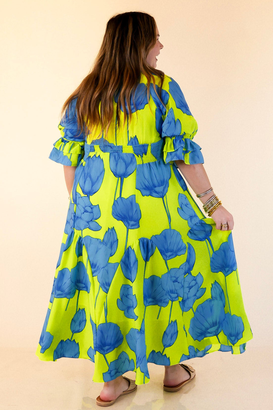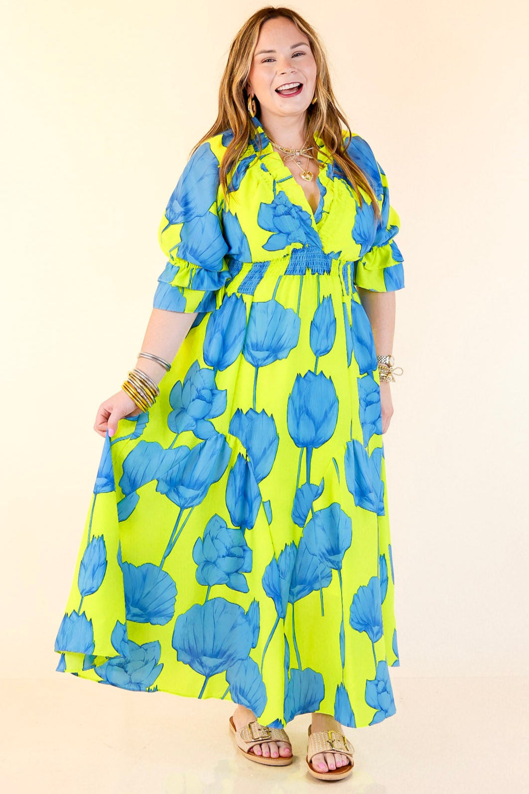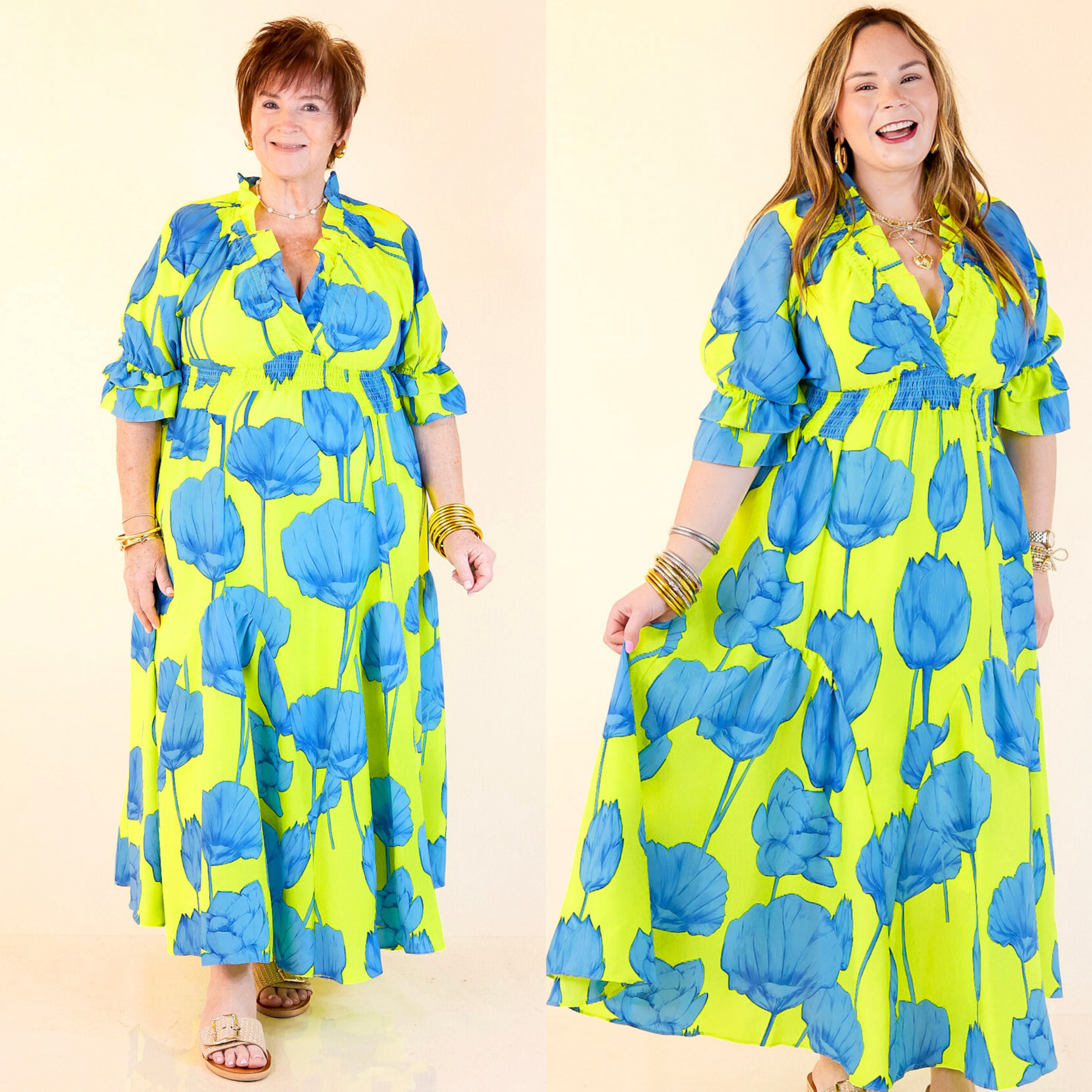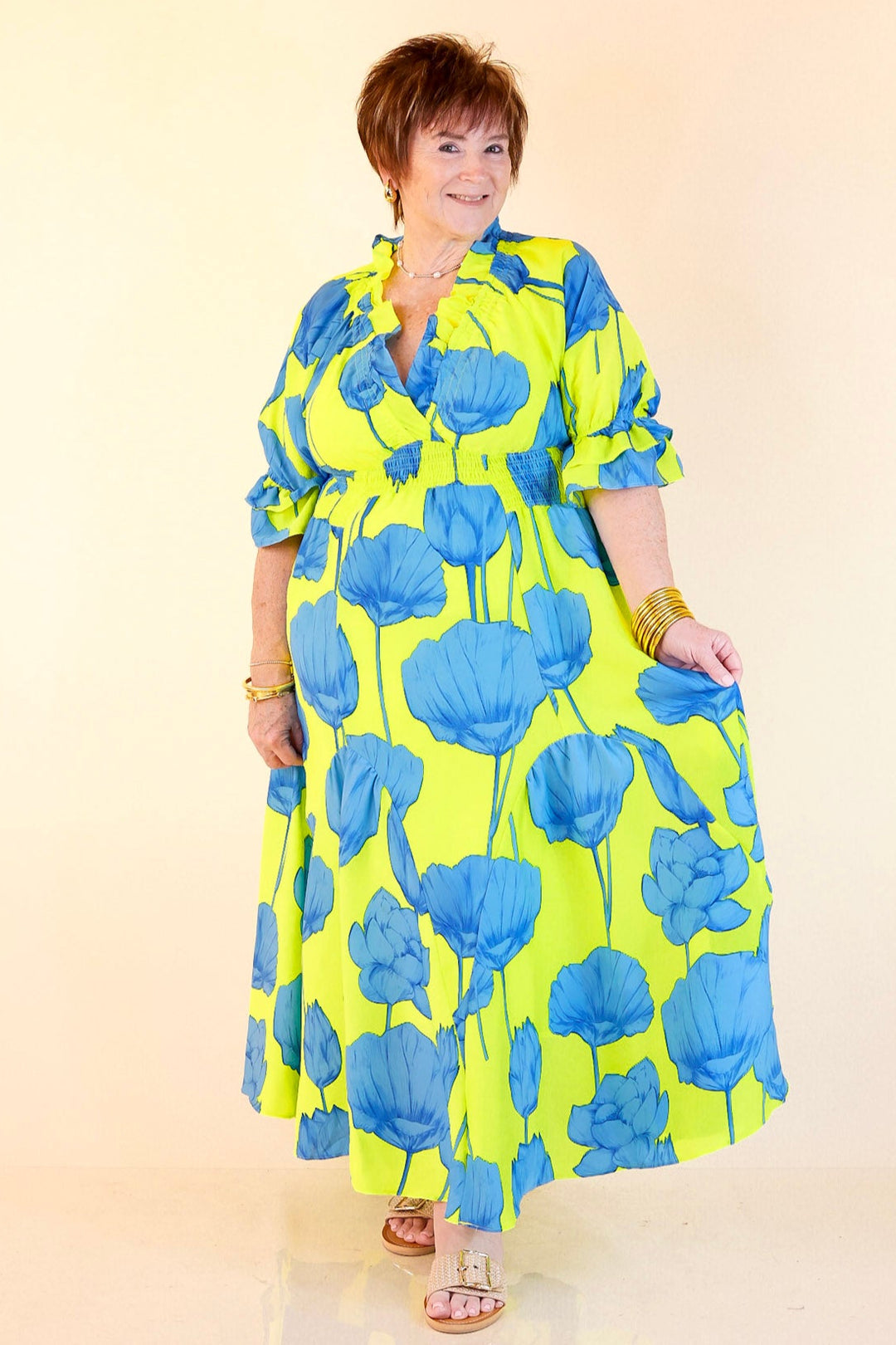 Bright, bold, and bursting with charm—the Breezy Belle maxi is your go-to for sunshine and compliments. With a Blue Lime floral print, ruffle puff sleeves, a flirty V-neckline, and a ruffled collar, it’s sweet with a twist. The smocked waist adds shape while keeping things comfy, and the flowy maxi length brings all the dreamy movement. Perfect for summer weddings, weekend getaways, or any moment worth dressing up for.