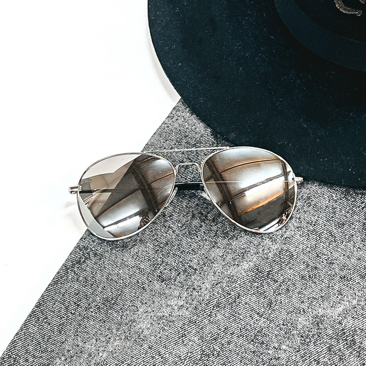 These are silver chrome mirrored sunglasses in an aviator style with a silver outline/frame. These sunglasses are taken laying on black/dak grey denim  and on a white background, with a black felt charlie horse hat in the back as decor.