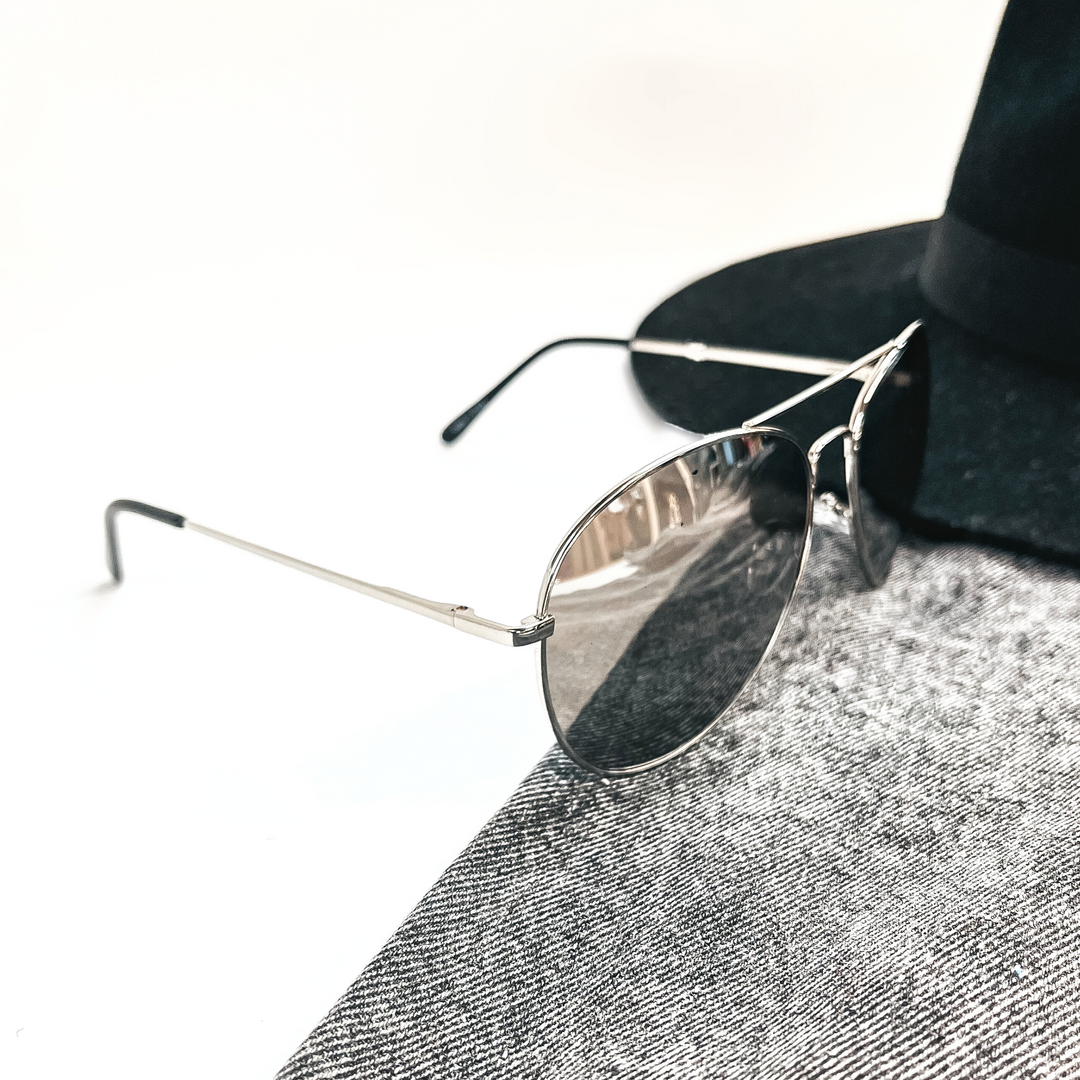 These are silver chrome mirrored sunglasses in an aviator style with silver frame/outline and black ear pieces. These sunglasses are taken on black/dark grey denim and a white background. There is a black felt hat in the back as decor.