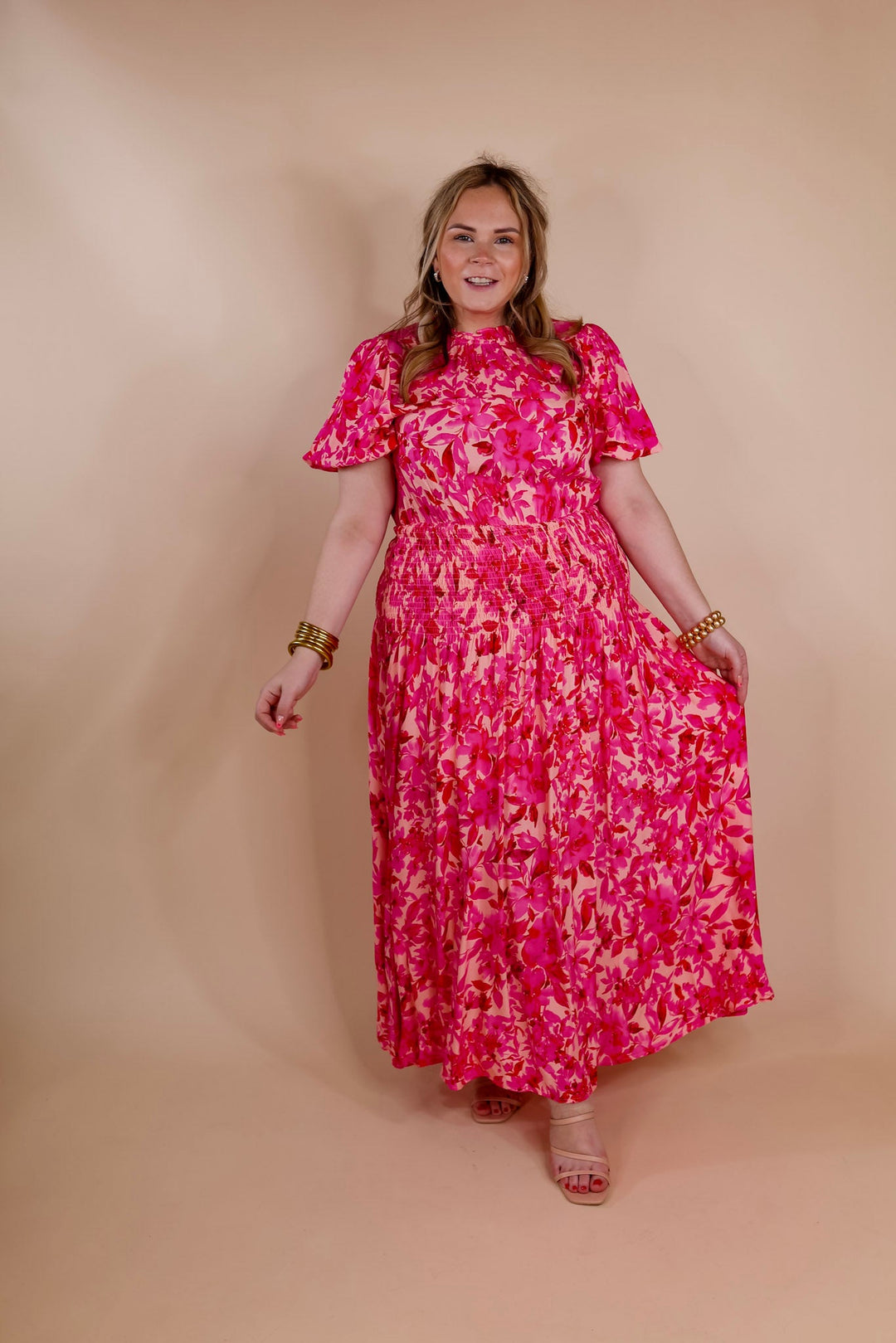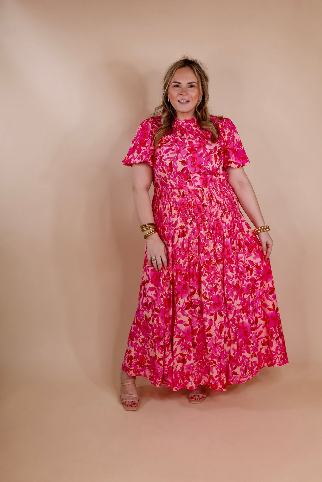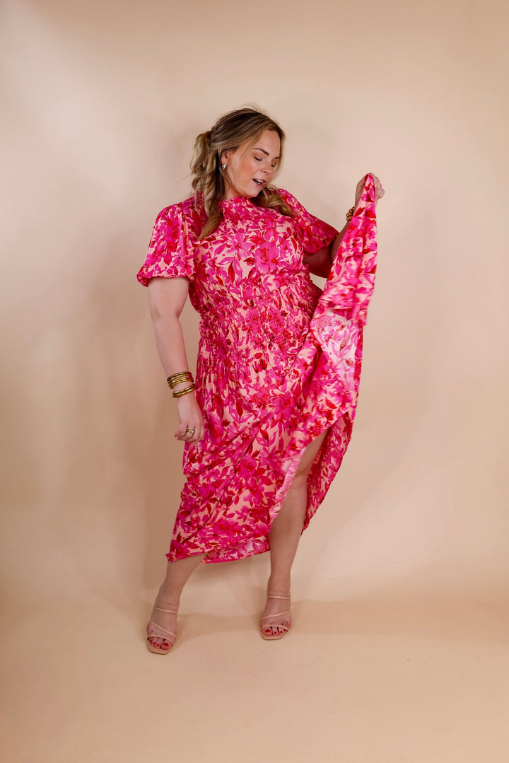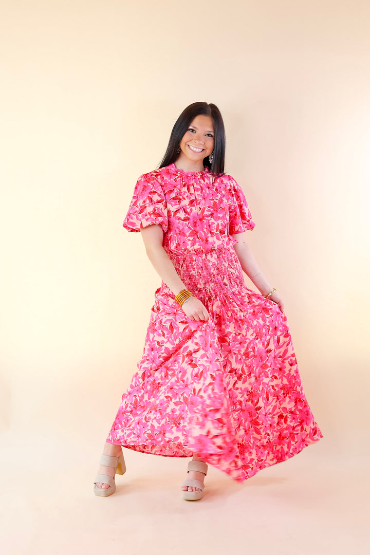 Moonlit Bay Floral High Neck Maxi dress with Smocked Waistline in Pink