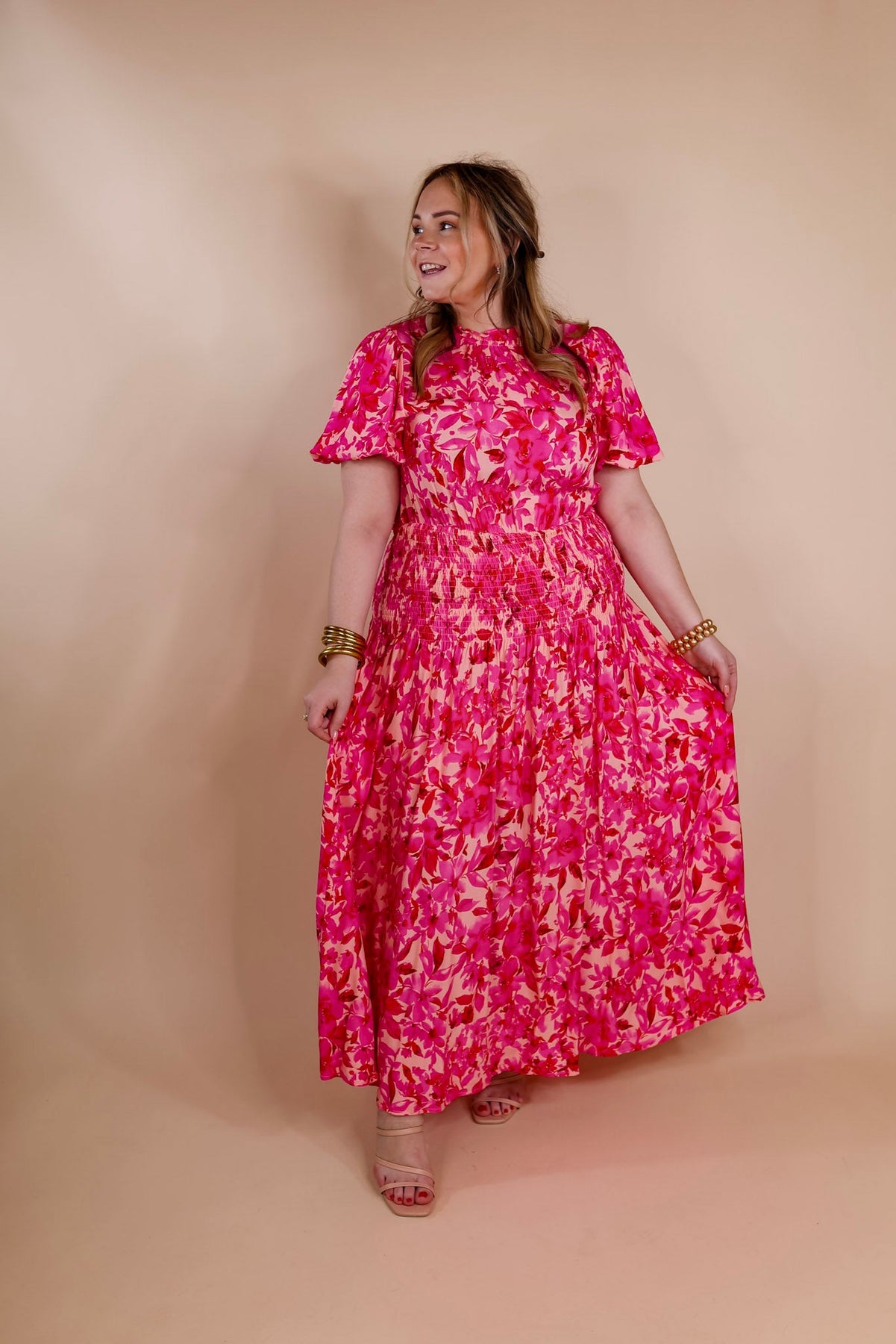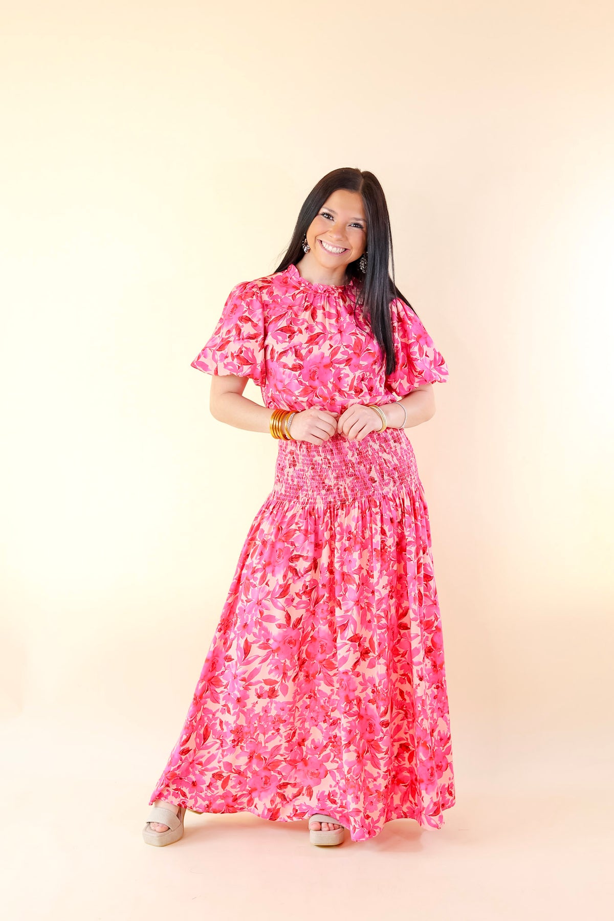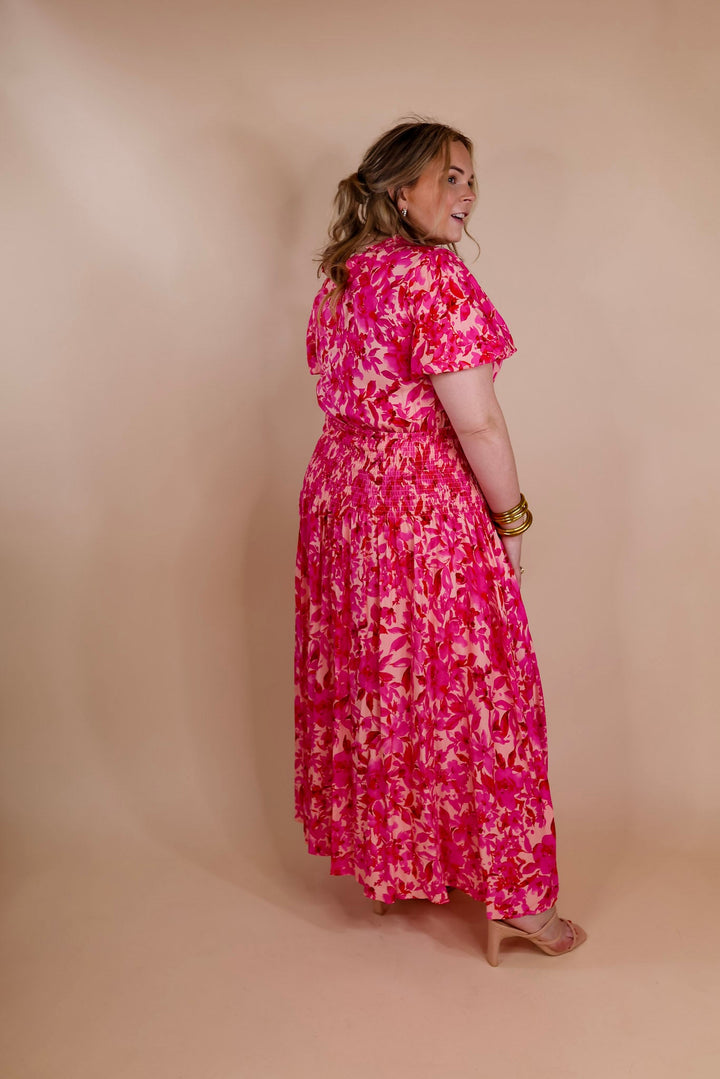 Moonlit Bay Floral High Neck Maxi dress with Smocked Waistline in Pink