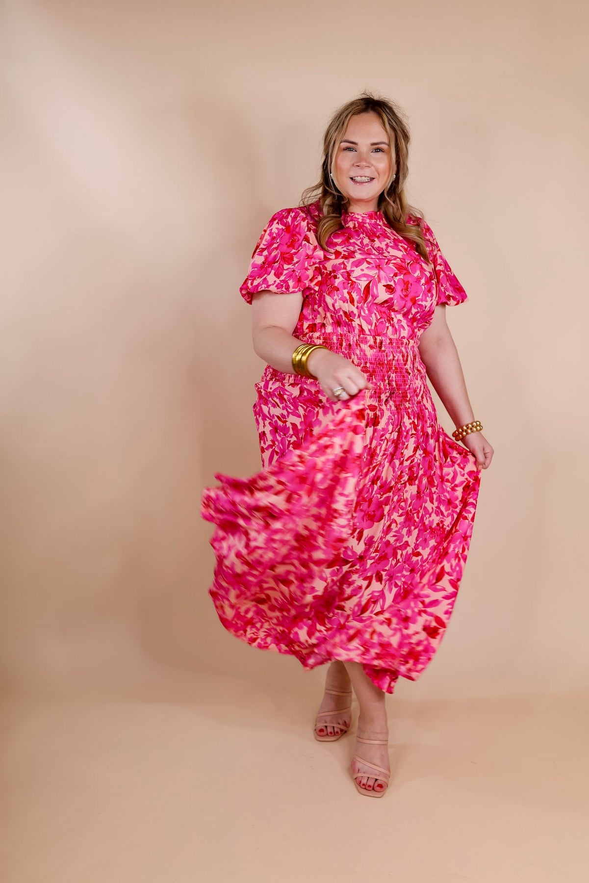 This adorable dress is giving us all the spring vibes! It includes a high ruffle neck, a smocked waistline, and a cute floral print. Pair it with a hat and heels and you're set! Dress is fully lined.