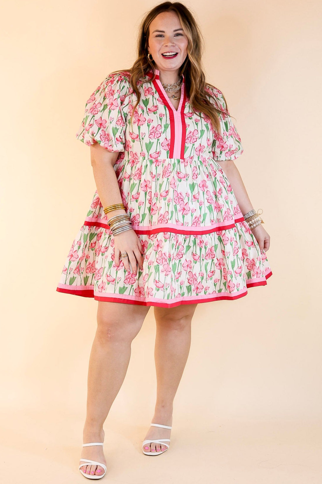Elevate your wardrobe with the Naturally Chic Dress, a perfect blend of effortless style and timeless charm. Featuring a flattering V-neckline and feminine short balloon sleeves, this dress offers an elegant yet playful silhouette. The tiered design adds a touch of flowy sophistication, while the off white background with pink and green floral accents makes it a versatile piece for any occasion.