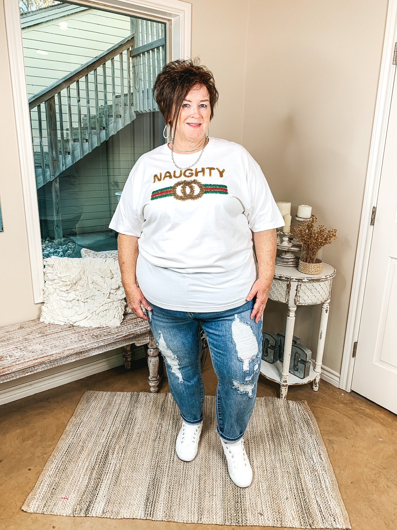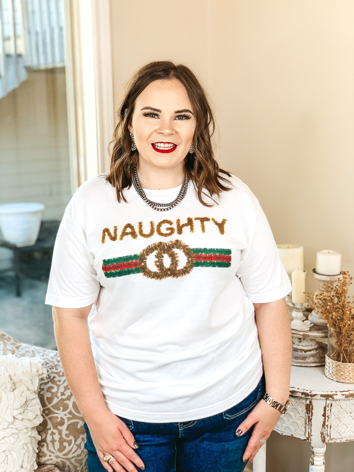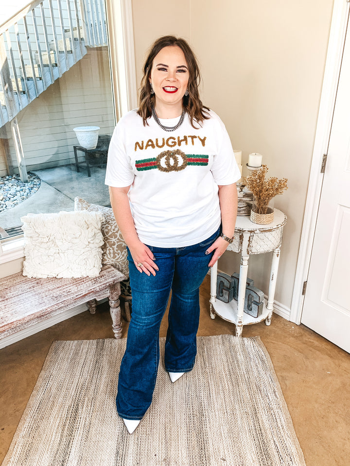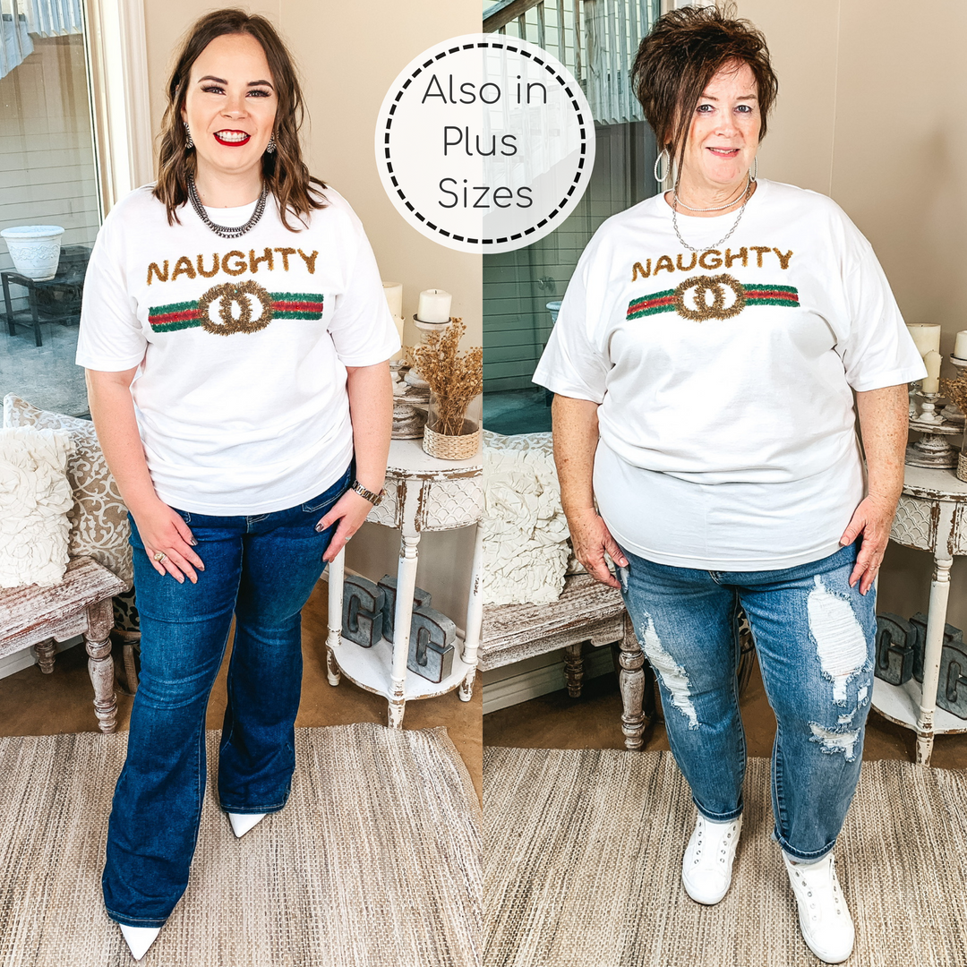 This adorable graphic tee is the perfect layering piece for the upcoming seasons! It includes short sleeves, a crew neckline, and a cute tinsel print graphic stating "Naughty" in gold, with a red and green symbol underneath. Throw a cardigan on over this cute tee and you'll be set for winter! Lily is wearing a size small. Abby is wearing a size L. Nancy is wearing a size 2XL.