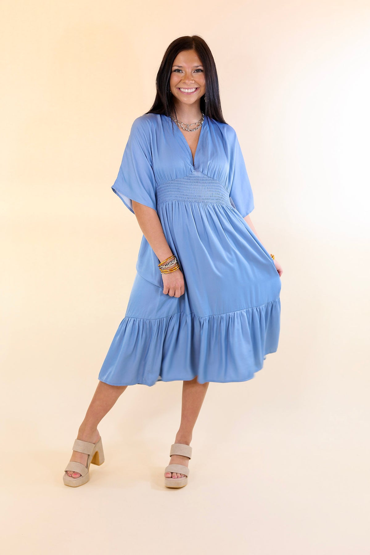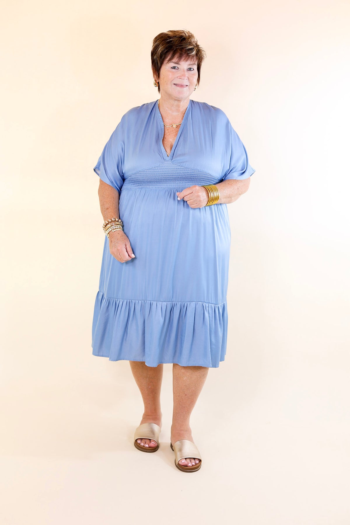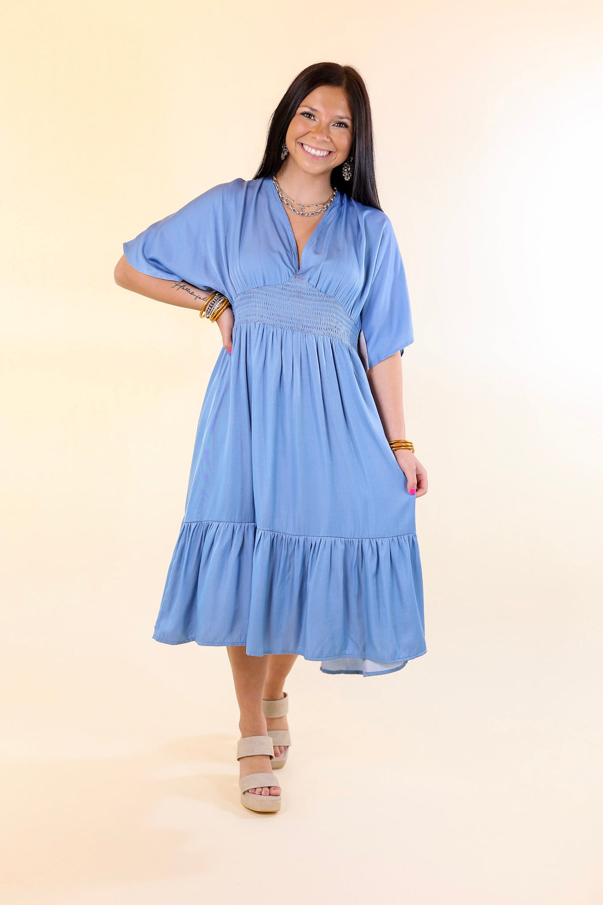 Stay on track to good style with this adorable new dress! It includes drop sleeves, a smocked section at the ribs, a midi length, and a ruffle hem. Pair this with wedges and a straw hat and you'll be set for the season!