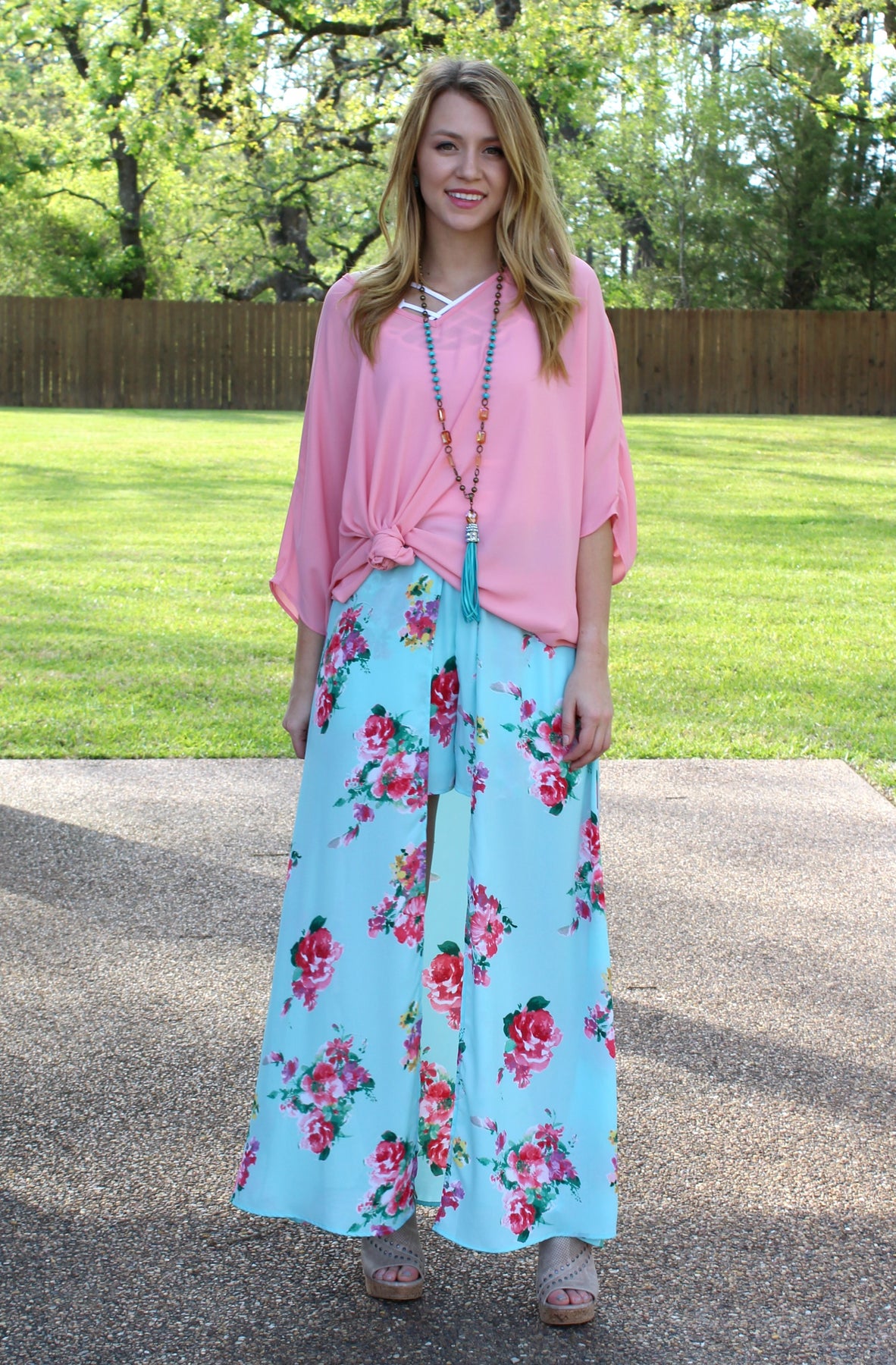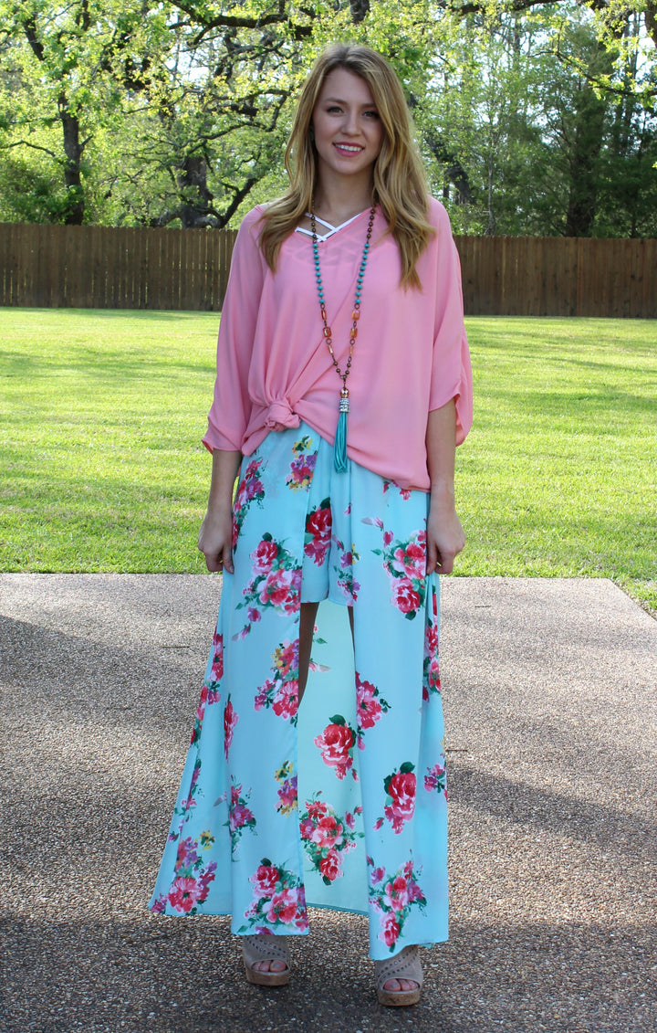 You're going to be looking like a million bucks in this maxi skirt! A beautiful sheer overlay adorned with pleated waist, fully lined shorts and an elastic waistband. Model is wearing size small.