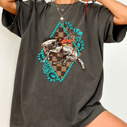 Ride into the rodeo season with our Bucking Horse Turquoise Concho Graphic Comfort Color Tee! Featuring a cowboy on a bucking horse in a diamond surrounded by vibrant turquoise conchos, this tee is perfect for all your rodeo activities. Stand out in style and comfort with this graphic tee.