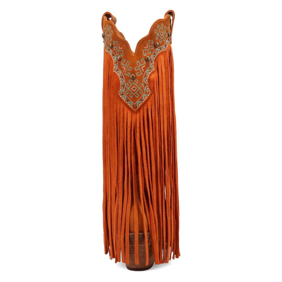 Elevate your western fashion game with Dingo's Tequila Sunrise Suede Boots. These long fringe boots in rust feature stunning turquoise embroidery and playful bronze studs. These boots are a must-have for any fashion-forward cowgirl. Preorder yours now!