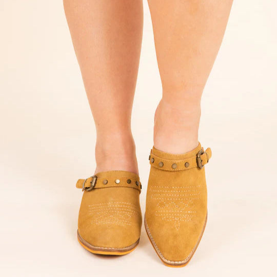 Elevate your style with Drancy, the fancy western-inspired mule in tan. Made from genuine leather, these boots feature an embroidered toe and studded harness for a touch of edge. With a 1.5 inch heel height, they're the perfect addition to your wardrobe.