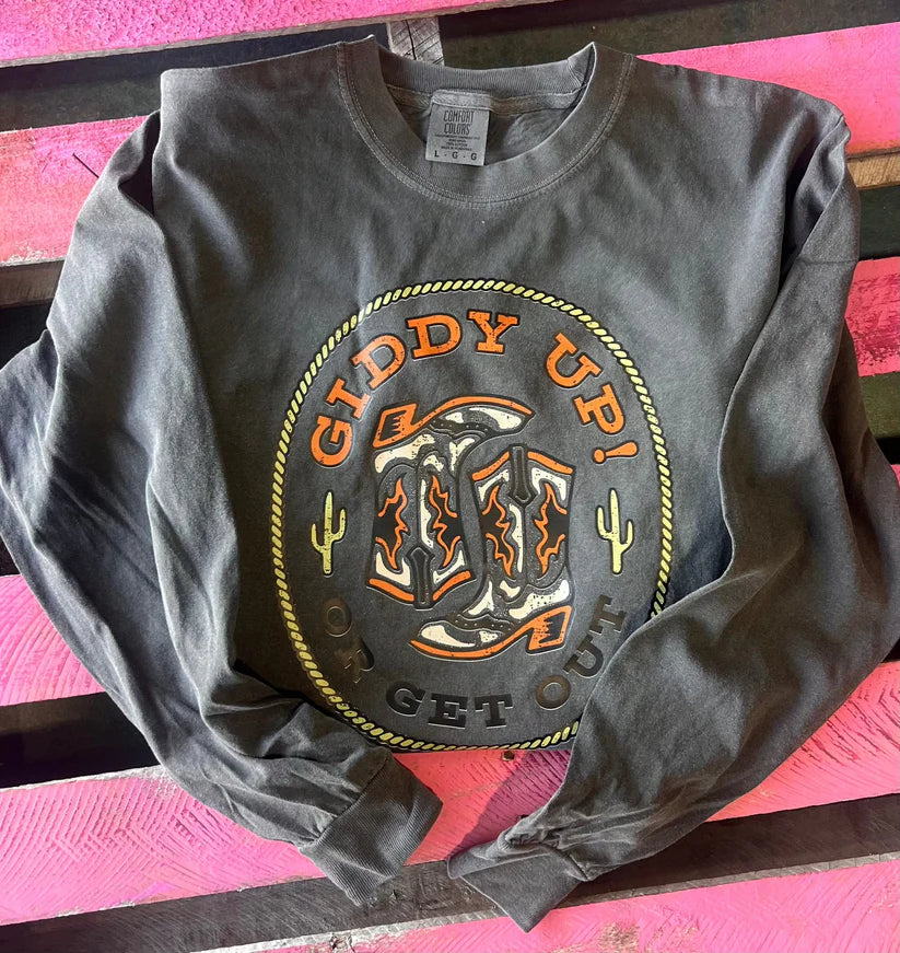 Saddle up for standout style with this exclusive "Giddy Up or Get Out" tee! Available in both long and short sleeve options, this statement piece delivers bold cowgirl attitude on ultra-comfortable Color fabric. Make your fashion declaration clear – you're either along for the ride or left in the dust!Printed on a vibrant Comfort Colors tee, it’s soft, pre-washed, and ready for anything—from honky tonk nights to brunch with your besties.