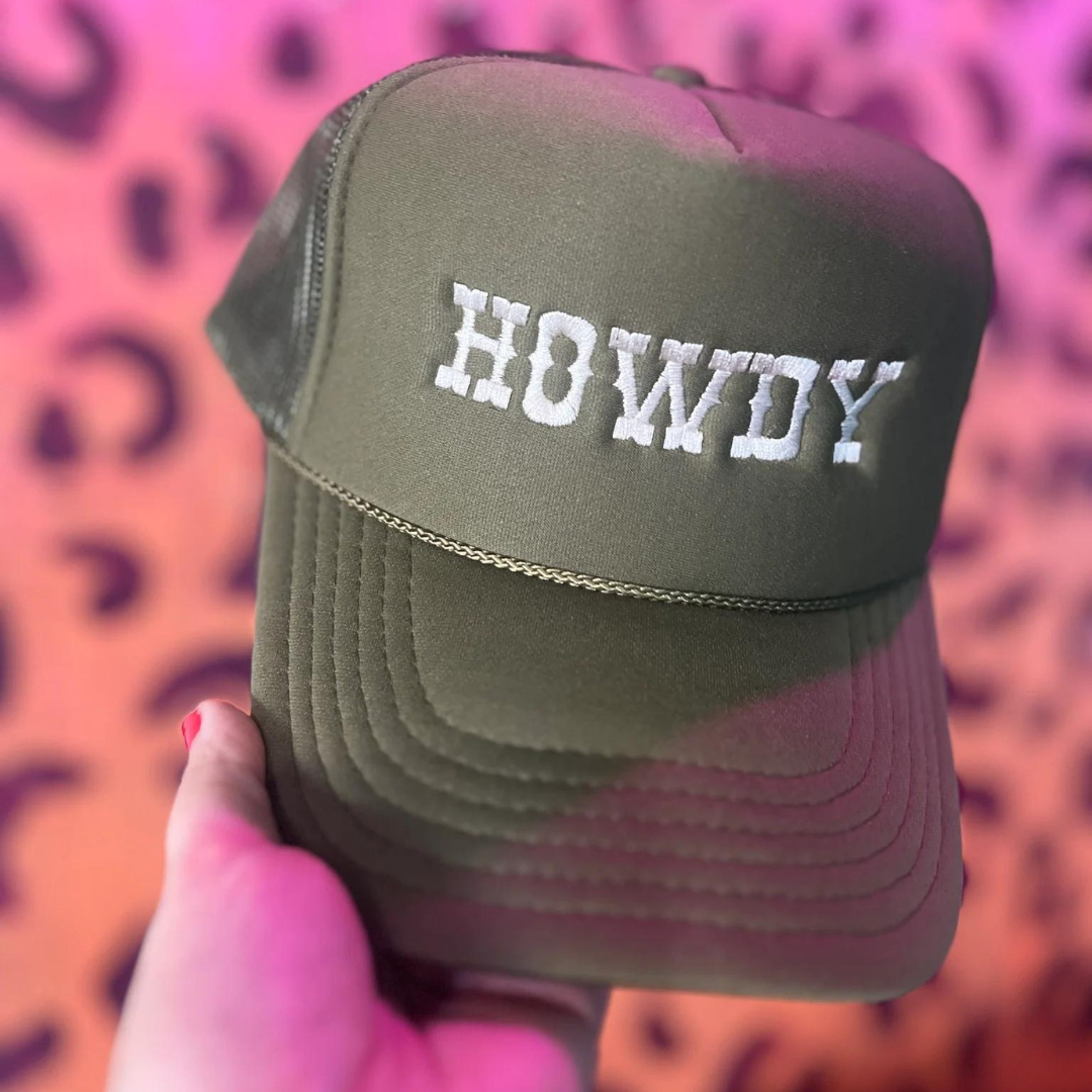 Introducing our "Howdy" trucker cap in the trendy olive green color. This versatile cap features bold white embroidery, making it the perfect accessory for any outfit. Show off your style and make a statement with this must-have cap!