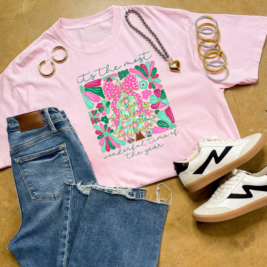 Get into the holiday spirit with our "It's the Most Wonderful Time of the Year" Graphic Sweatshirt! This design features a vibrant floral Christmas tree topped with a pink polka-dot bow, surrounded by whimsical blooms in shades of pink, teal, and green. Accented with shimmering gold details, this sweatshirt blends festive cheer with a splash of playful color, making it perfect for holiday gatherings, gift shopping, or cozy nights by the fire.