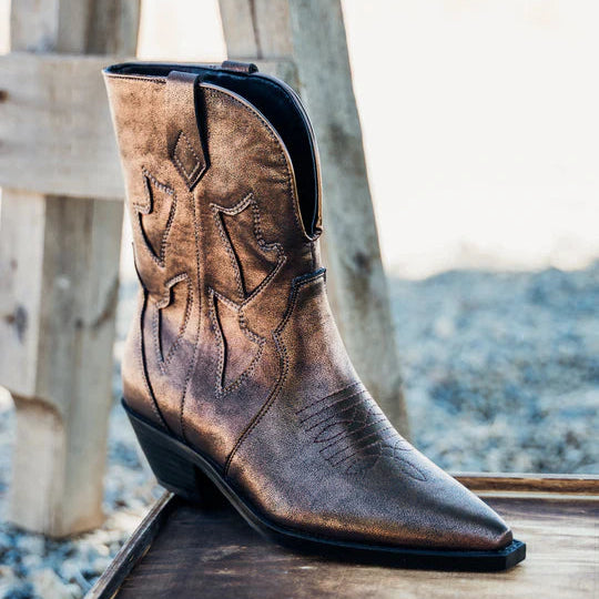 Make a statement with these metallic bronze western boots that will put you in the spotlight. With elaborate stitching and fiery details, these boots bring a bold touch to any ensemble. The pointed toe and low block heel add a touch of classic cowboy charm, while the distressed finish gives them a contemporary, lived-in look. Whether you're out at a rodeo, a music festival, or just enjoying a casual day, these boots embody both style and attitude - a true standout. Mid calf rise with a 10 inch shaft height, open front design, snip toe style, and 1.5 inch heel height make for a perfect fit. Plus, the padded footbed adds extra comfort for all-day wear.