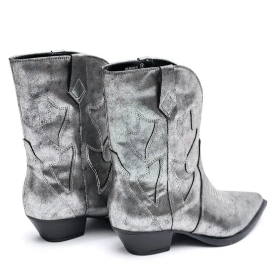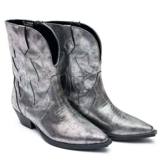 Make a statement with these silver metallic western boots that will put you in the spotlight. With elaborate stitching and fiery details, these boots bring a bold touch to any ensemble. The pointed toe and low block heel add a touch of classic cowboy charm, while the distressed finish gives them a contemporary, lived-in look. Whether you're out at a rodeo, a music festival, or just enjoying a casual day, these boots embody both style and attitude - a true standout. Mid calf rise with a 10 inch shaft height, open front design, snip toe style, and 1.5 inch heel height make for a perfect fit. Plus, the padded footbed adds extra comfort for all-day wear.