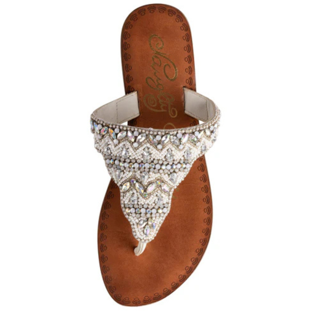 Elevate your wardrobe with these stunning white jeweled sandals, a must-have staple item that is sure to impress. These sandals are perfect for any occasion, including weddings! Their genuine leather upper and footbed, paired with a true-to-size fit, make them a versatile and comfortable choice.