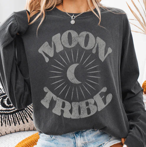 Unleash your inner moon child with our Moon Tribe Graphic Comfort Color Sweatshirt! Made from soft black pepper fabric, this long sleeve Comfort Colors tee features a stunning moon and burst graphic, perfect for those who love to stand out. Elevate your wardrobe with this unique and stylish piece.
