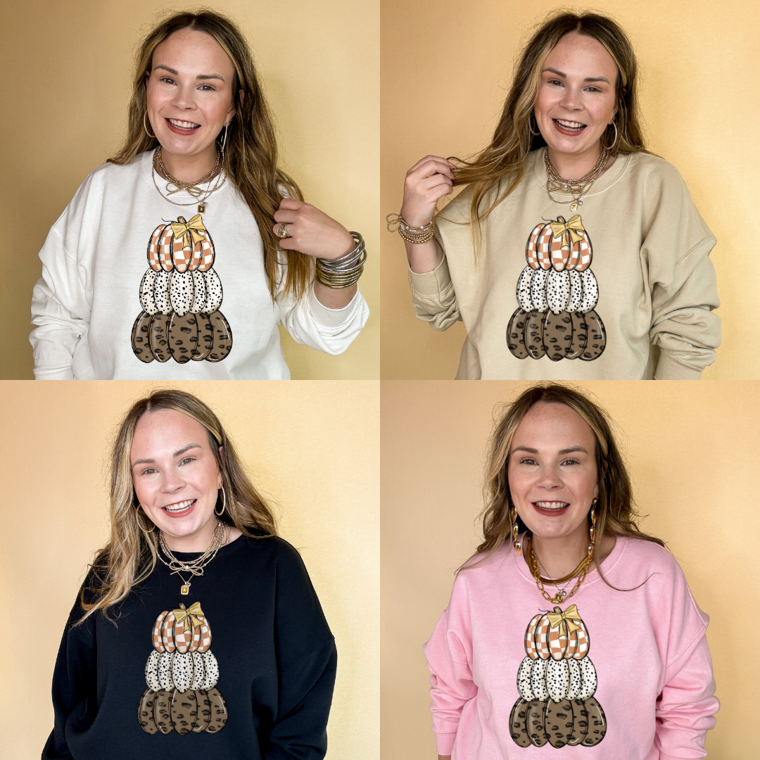 Introducing our Stack of Pumpkins Graphic Sweatshirt. Available in multiple colors such as pink, cream, white, and black, this sweatshirt showcases a vibrant orange and white checkered pumpkin for a cheerful pop. The sleek white pumpkin adorned with charming black dots adds a whimsical touch, a bold cheetah print pumpkin and finally a little yellow bow to bring the look together. Creating a fun and stylish display that perfectly captures the spirit of fall!