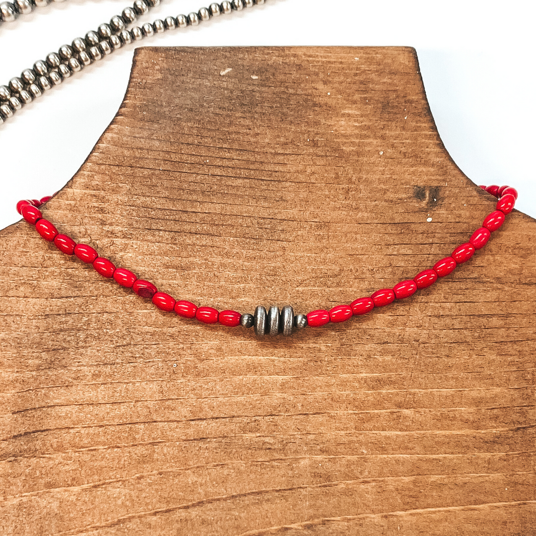 Oval Bead Necklace with Silver Saucer Beads in Red